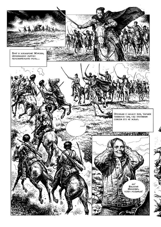 Настоящий Василий Иванович Чапаев погиб 5 сентября 1919-го года. Киношный Чапаев в 1934-м переплыл Урал и шагнул в Вечность. Где-то он еще бродит по земле, хитро щуря глаза, подкручивая усы и демонстрируя мудрость и смелость. Напомнить о его присутствии среди нас поможет этот комикс. Своевременно ли он вышел? Про Чапаева наплели массу обидных и гадких сплетен (впрочем, это коснулось всех героев Гражданской, взять того же Гайдара), и с этим надо что-то делать. Опять же, напомнить людям о хорошем кино тоже никогда не поздно. А вот фразы Чапая про «смертельный бой за интересы трудового народа», про интересы революции, которые должны быть дороже жизни могут у кое-кого вызвать злобный зубовный скрежет. Ну, у тех самых людей, кумиры которых драпали в Гражданскую, предавая отечество на деньги объединенной Европы, раздавали интервентам золотой запас Империи и потом мечтали о балах, лакеях, юнкерах и хрусте французской булки. Что в речах Чапаева точно резонирует с временем, так это фраза «Мы должны быть сильными, чтобы с нами считались». Опять прав Чапай.