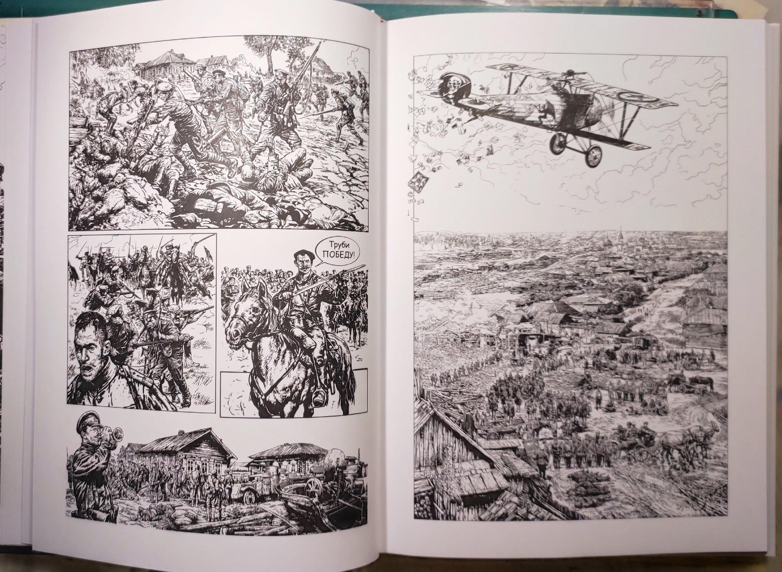 Так вот, комикс Юдина/Воронина тоже не про настоящего Чапаева. В основе тут кинофильм. Поэтому не стоит удивляться, что события следуют сценарию киноленты, а все персонажи имеют портретное сходство с игравшими их когда-то актёрами. Некоторые сцены кинокартины перекочевали в комикс также целиком, взять хотя бы культовый кадр с Василием Ивановичем, показывающем своему ординарцу Петьке (персонажу, также вошедшему в вечность народной мифологии), куда лупить из пулемёта, этот кадр стал в своё время афишей фильма. События разворачиваются в августе 1919-го года, в разгар Гражданской войны, которая для всех сторон конфликта складывается с переменным успехом. В боях за Урал Чапаев участвует везде и сразу: то чешских интервентов отправляет удобрять русскую землю, то устраивает курсы для нерадивых бойцов по обращению с личным оружием, то принимает пополнение, то воюет под огнём противника, то казаков бьёт, то подавляет бунт, то разрабатывает стратегические планы, то травит байки. Показан человек дела, человек нескончаемой энергии, при этом простой и справедливый, разрешающий некоторые ситуации не только по законам военного времени, а по совести. Неудивительно, что люди в нему тянутся даже с вражеского, белого лагеря, где бывшие царские офицеры показаны кончеными мразями, но их суть прикрыта напускным благородством и разными сусальностями типа хоругвий. Показательный момент, который отлично заходил аудитории в 1934-м, вызывал полное понимание во времена ВОВ, но способен в настоящее время инициировать мощное зарево в среде народившихся имперских патриотов: «Ну что, дружок, не помог тебе твой Бог?», спрашивает Чапаев у мёртвого противника, возле которого лежит анархистский чёрный флаг с надписью «С нами Бог!». Спрашивает без иронии, серьёзно, ведь для него это один из основных идеологических моментов братоубийственной войны, её философская суть. А Чапай – не просто хитрый мужик из сказок, способный обвести вокруг пальца и попа, и чёрта, он еще и философствующий аскет нарождающейся новой веры. Его рассуждения о построении грядущего справедливого мира и объяснение, ради чего вот эти люди вокруг сейчас воюют, больше напоминают пророчества, в исполнение которых даже не нужно верить – надо просто понимать, что всё, о чём «проповедует» Чапай, неизбежно и неотвратимо уже сияет впереди ярким светом, надо вот только сейчас напрячься и всё получится. И эти черты проповедника и пророка сделали Чапаева не только героем анекдотов, но и мудрецом из пелевинского романа, постигшим суть жизни. Наверняка он постиг и то, что пройдёт совсем немного времени и враги, мотивированные точно такими же фразами про Высшее существо, выступающее на их стороне, будут сеять смерть на земле, которую он, Чапай, защищает и очищает.