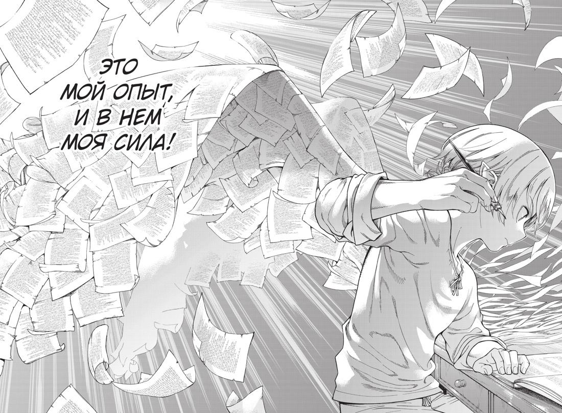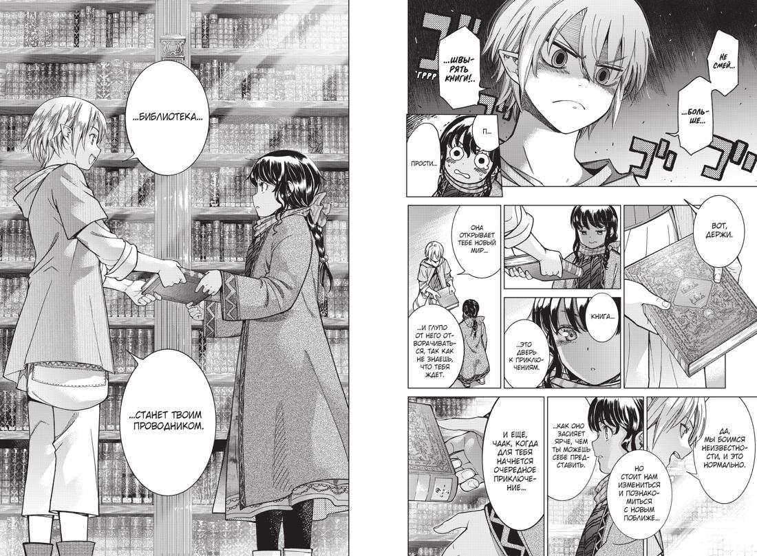 Во время следующей остановки торгового каравана Сио сведёт знакомство с Михоной Коахау, хвастливой девушкой тринадцати лет, которая также направляется на экзамен в Ахцак. Поэтому конкурент ей точно не нужен, но по воле судьбы ей и Фумису придётся объединить усилия в борьбе с книжными ворами. Не теми, кто украдкой тырит книги в книжном магазине, тут прям ОПГ, нападающая на книжные лавки в те дни, когда туда завозят очередной том сериального блокбастера и у дверей вырастает длинная очередь из желающих узнать о том, что же там будет дальше с любимыми героями. Зачем воровать книги? Чёрный рынок литературы в этом мире очень развит, а ещё эта ситуация освещает извечный конфликт между книжными лавками и библиотеками, где книги можно брать бесплатно и, значит, это плохо сказывается на бизнесе. Вообще сюжет манги устроен так, что любая ситуация для Сио - это пополнение его багажа знаний, поиск и сбор информации, которая наверняка пригодится ему в дальнейшем. Также это поиск новых знакомств, полезных и не очень, а в одном из эпизодов юноша обзаведётся даже ручным питомцем. Потому, что главный герой манги без пушистого друга, претендующего на роль маскота и любимца фанатов, согласитесь, это как-то странно. Правда, для того чтобы пушистый друг уехал дальше с Фумисом, юноше придётся в буквальном смысле пострадать. И получить очередной урок, на этот раз о материальной ценности книг и о том, почему важно в этом во всём разбираться.