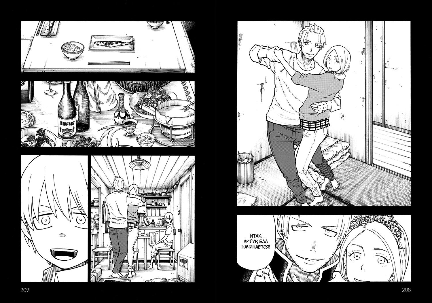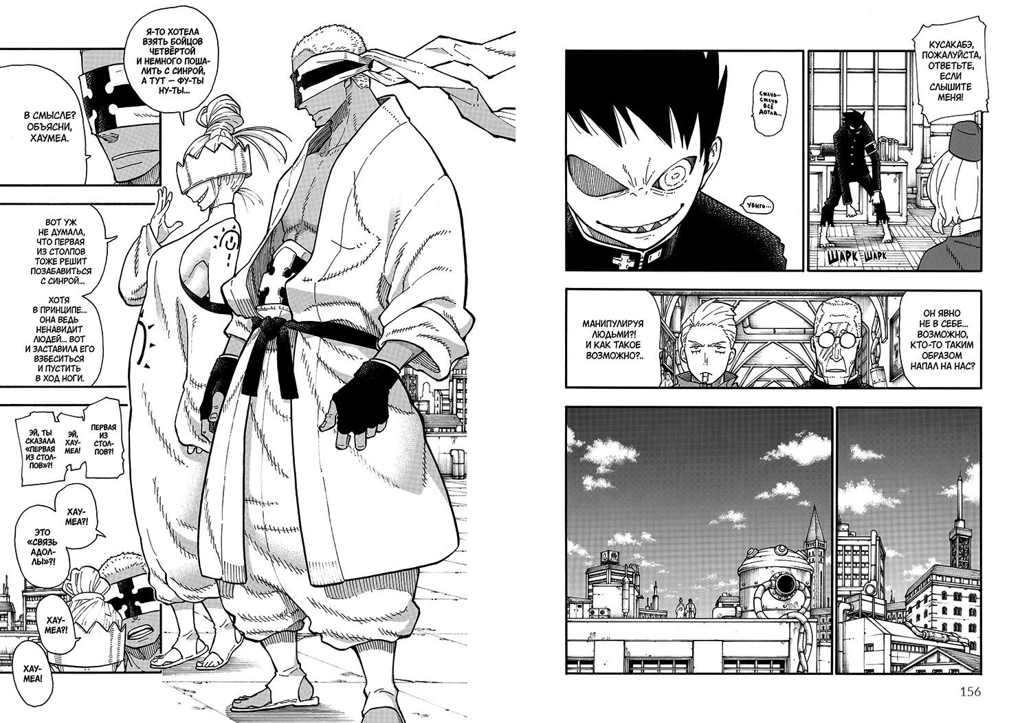 Собирая носителей «Взрыва Адоллы», слуги Проповедницы готовы на всё. Если нужно устроить массовый пожар, напоминающий по своим масштабам трагедию двухлетней давности – пожалуйста, да гори оно всё огнём, и пусть по улицам бегают демоны-огневики. Пожарным приходится объединить силы, а заодно Артуру нужно обуздать слетевшего с катушек Синру. Кстати, одного грустного флэшбэка хватит, чтобы объяснить, почему, собственно, Артур решил, что он рыцарь. Основная битва во второй половине шестого тома – первой половине седьмого тома разворачивается вокруг девушки по имени Инка, которая обладает «взрывом Адоллы», но использует его в корыстных целях: чувствуя, в каком доме вот-вот начнётся пожар, она с подельниками спасала жильцов, но после требовала «денежное вознаграждение». Синре нужно её отговорить от сотрудничества с «людьми в белом», но это сложно сделать, когда вокруг всё горит, демоны плохо поддаются отпеванию сестёрами монашеского ордена, а противник Харон навязывает поединок один-на-один. Пока у коллег Синры в ход идут девайсы для борьбы с огнём под названием «Термоакустический охладитель» (на первый взгляд, абсурдная штука, но есть реальные разработки по теме тушения пожаров звуком, мангака явно следит за тенденциями), а огненные смерчи закручиваются в ледяные цунами, Кусакабэ приходится искать методы борьбы… в старом рокерском жесте, когда пальцы складываются «козой». В рамках сюжетного лора всё выглядит даже логично, герой – Демон и жест изображает рогатого обитателя ада, где, как известно, бушует огонь, совсем как на улицах токийских городов. Вот так неожиданно перед нами разворачивается манга в стиле «рок», в присущем этому стилю музыке и жизни драйвом, огоньком и воплями «Ееееее!».