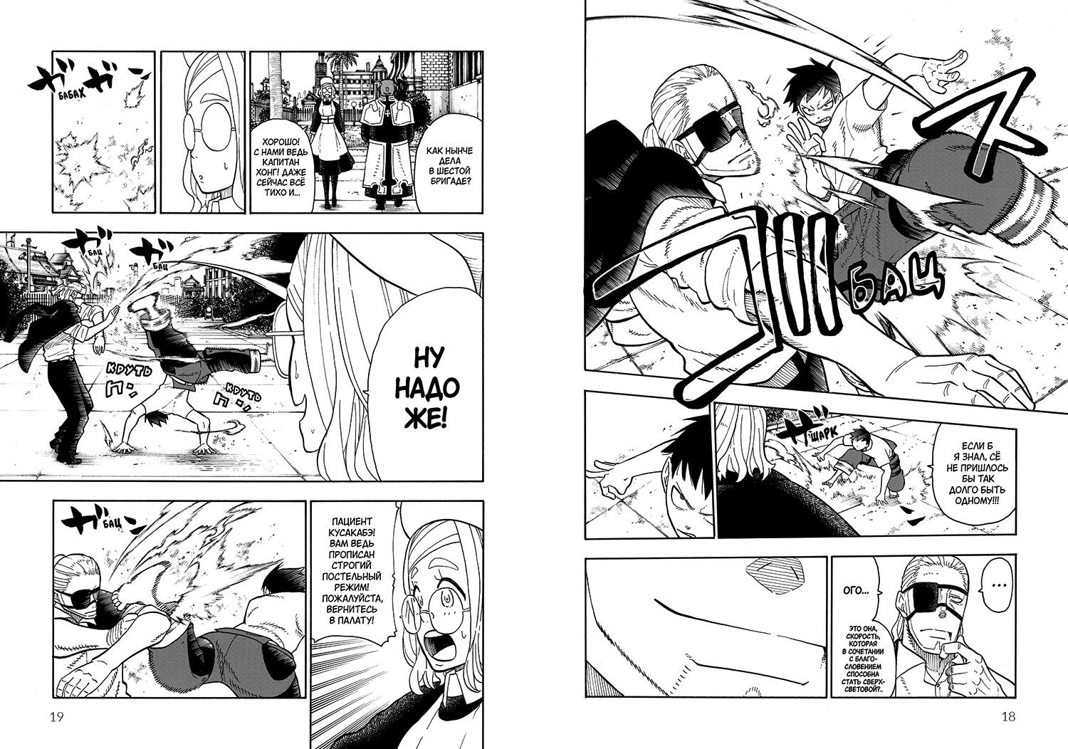 Поскольку «Бригада пылающего пламени» является образцовым сёнэном (мангой, рассчитанной на юношей), по канонам жанра здесь много поединков. Вот стоит только добиться Синре встречи с важным человеком, способным пролить свет на его прошлое, как тут же начинается заваруха с боевыми приёмчиками и громким выкрикиванием их мудрёных названий. Да Синре даже идти никуда не надо, обычный диалог в больнице превращается в драку. В пылу которой, однако, на читателей обильно высыпаются крупицы полезной информации. И ведь нельзя обвинить Синру в том, что он безбашенный и несдержанный зачинщик этих поединков, вовсе нет, это некая загадочная женщина управляет им, нашёптывая пробуждающие его внутреннего демона слова. Стильный, пусть и немного подростковый пафос этих сцен Окубо разбавляет своим фирменным юмором, а ведь у этого автора в «рукаве» есть героиня, постоянно влипающая в фансервисные ситуации против своей воли. Однако, сполна оторваться на ниве фансервиса в этот раз Ацуби решает за счёт вполне реальной ситуации: так повелось, что в разных странах местные пожарные участвуют в фотосессиях для ежегодных календарей, демонстрируя накачанные мужественные тела. Подобная традиция существует и здесь, да ещё и в виде соревнования, в котором восьмой бригаде стабильно не везет. Зато читатели могут сделать перерыв, наблюдая за комичностью ситуации с переодеваниями.