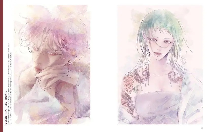 «Вселенная «Ты мой!»» посвящена самой, пожалуй, известной манге Джо. Тут сконцентрировано большое количество цветных артов, иногда это нежные пастельные оттенки в стиле Учителя Гуа (см. обзор на её артбук «Когда цвет встречает звёзды»), иногда Котляр использует более сочные цветовые решения. Пересказывать сюжет манги не буду, но там всё крутиться вокруг городских тусовщиков, которые всё никак не могут разобраться в отношениях друг с другом. Плакатная молодёжь, юноши, красиво позирующие в облаке падающих листов сакуры и всячески демонстрирующие, что разница между понятиями «хороший мальчик» и «плохой мальчик» может быть очень незаметной, дамы с дерзким взглядом. Здесь акцент сделан на двух вещах: чувственности и моде, причём последняя максимально разнообразно проявляет себя в костюмах персонажей. Следующие пару глав посвящены классике. Сначала мы видим «Ромео и Джульетту» в интерпретации Джо, зачем, внезапно, гоголевского «Вия». Здесь есть и черновые эскизы, и созданные на их основе полноцветные арты, воссоздающие ключевые моменты двух великих произведений. Конечно, это не совсем «стандартный» взгляд на столь известные вещи, однако, он отражает наметившуюся в книгоиздательском бизнесе тенденцию выпускать классику в том виде, в котором она скорее заинтересует молодежь. Для этого отлично подходит аниме-эстетика и прочие модные фишки, помогающие школьникам при взгляде на обложку идентифицировать Шекспира и Гоголя как «своих». Занятно, но лично я уже точно не смогу принять Хому Брута в образе красавчика из популярной группы (или из культового аниме типа «Gravitation»), а вот мрачноватая атмосфера определённо задаёт тон.