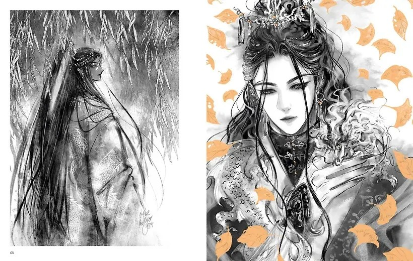 «Мелодия для короля» изначально должна была стать мангой, но в силу обстоятельств получилась текстовым романом с иллюстрациями Котляр. Собственно, в данном разделе иллюстрации, арты и эскизы по этому проекту и собраны. С первоисточником не знаком, но, судя по картинкам, это что-то фэнтезийное про аристократов и правящие династии, отчего здесь у персонажей просто роскошные костюмы. Сами персонажи - статные юноши, иногда трагичные, иногда жеманные. И очень часто обнимающиеся друг с другом, демонстрирующие проскакивающую между ними химию. Но наверняка это всё о настоящей дружбе и не более. Да и готические красавицы-лолиты в стиле вампирских благородных семейств тут тоже присутствуют. Часть артов явно отсылает к таким хитам, как «Благословение небожителей», но это в более полном объёме проявлено в следующем разделе, называющемся «Азиатский сеттинг». Андрогинные персонажи в окружении драконов (порой выделенных нефритовым цветом на чёрном фоне), огонь, снег, церемониальность… всё очень эстетично и максимально красиво. А цветной разворот из скетчбука полностью передает стиль традиционного азиатского арта. История «Не грусти» нарисована для международного конкурса немой манги, заданием для Джо было изобразить без слов слова «грусть» и «дружба». Так большеглазый, восторженный мальчик в матроске и бескозырке встретил ангела (наверное).