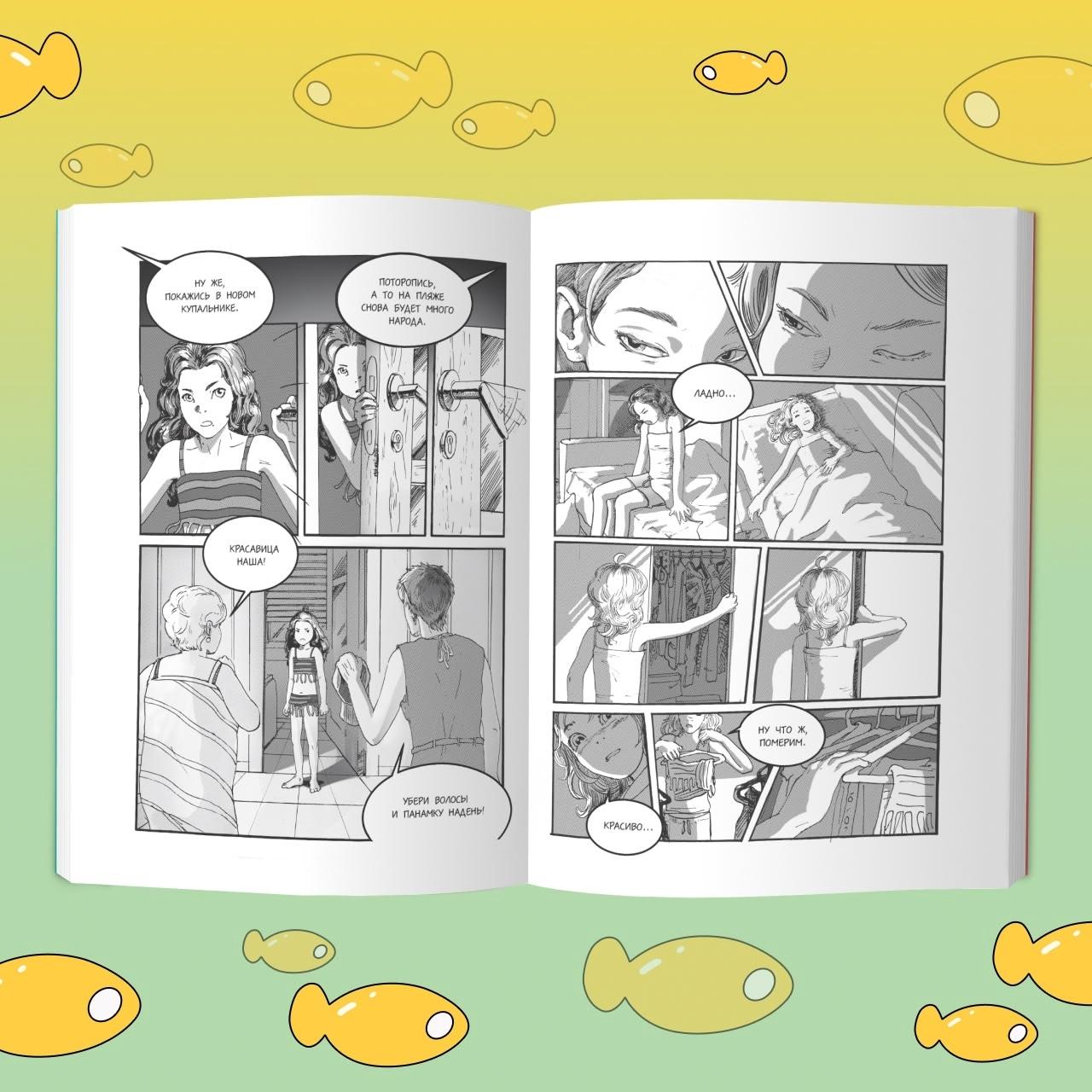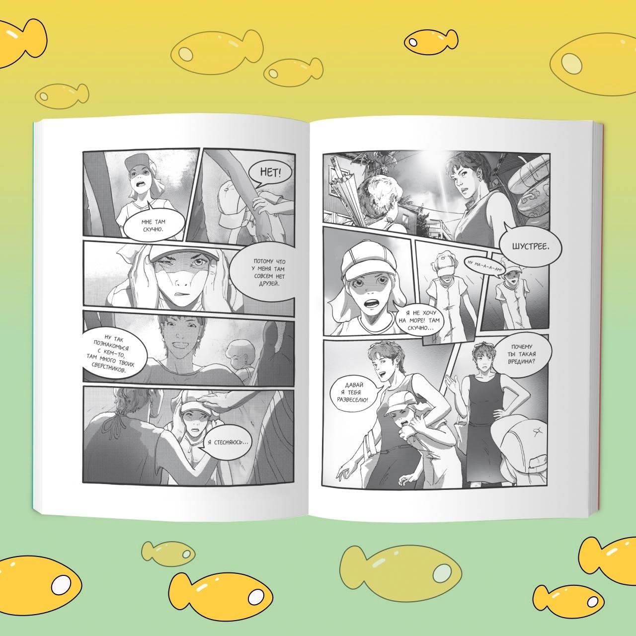 В общем, если вам эти чувства и настроения тоже знакомы, то нас с вами в контексте данного комикса можно назвать «коллективной девочкой Настей». Отдыхающей вместе с мамой и бабушкой в «коллективно-бессознательном Адлере». Утром дамы идут к морю по жаре, Настя мечтает о лимонаде, а на пляже между нагромождения аляповатых зонтиков уже разносятся вопли «Кукуруза! Чурчхела! Холодное пиво!». Настю всё это уже «слегка» достало. Что может изменить её настроение? Только знакомство с жизнерадостной девочкой Элей, которая сама к ней подошла и предложила послушать, как шумит море в ракушке. Да не в простой, а в волшебной. Пусть и волшебство это случается лишь в детском воображении, двум девчонкам этого достаточно, чтобы под брызги волн перенестись в сказочный мир, на необитаемый остров, где можно плавать среди морских обитателей сколько угодно и встречать красивейшие закаты.