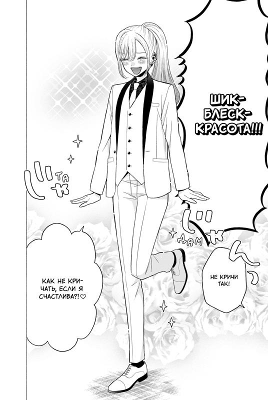 Марин стремится добить всех неожиданным твистом и выбирает персонажа из популярнейшего сериала, девушку, которая выдаёт себя за молодого человека, работающего хостом в соответствующем заведении. Хост – ещё одно специфическое японское явление, вроде бы не то, о чём нужно говорить в школе, но этого персонажа все школьники знают, все девчонки от него фанатеют, а в самом сериале есть сцены, с помощью которых косплеер запросто сможет всех вокруг довести до слёз умиления, если хорошо отыграет роль на сцене, а непросто будет ходить туда-сюда. Так начинается процесс превращения Марин в девочку-юношу, и эта трансформация займёт большую часть тома. Гёдзе освоил азы портновского дела и мейкапа, пришло время перемещаться на более продвинутый уровень «профи», где ещё больше нюансов, лайфхаков и секретов. Изучивший ассортимент всех специализированных магазинов для косплееров парень внимательно приглядывается к визуалу «конкурентов», изучая хитрости. Вот у одной косплеерши парик на голове заметен, а у другой сразу и не поймёшь, есть он или нет. Как добиться в этом вопросе реалистичности? Нужны волосы, ножницы, плойка, клей и кое-что ещё. Перед Марин же стоит более сложная задача: ей нужно не только вести себя, как красавец-хост, от которого млеют дамы (при том, что Марин не очень понимает, как это «так» себя вести, нужен совет бывалых), но и полностью перевоплотиться в юношу. А Фукуда слишком часто делала акцент на формах Марин, которые так просто из головы уже не выкинешь.