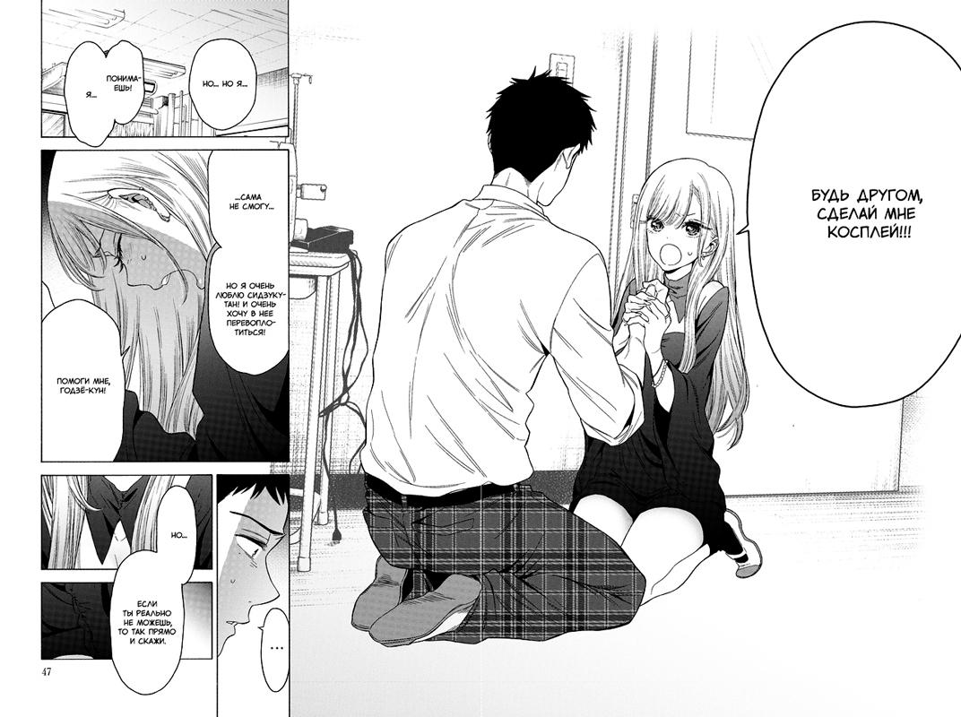 Дальнейшее развитие сюжета вполне способно заинтересовать читателей с разными вкусами. Создатель манги очень подробно, но без занудства, а так, чтобы всем было интересно, рассказывает о кройке и шитье, делясь профессиональными секретами. Очень детально, как уже сказано выше, погружается в секреты правильного макияжа. И с восторгом, который буквально передаётся читателю, делится впечатлениями той же Марин о её первом фестивале косплея. При это не забывая сделать акцент на том, что в этом деле не так всё легко и просто, главная героиня на своём примере узнает, каково это – трудиться до мокрых трусов. Также повышенное внимание отведено раскрытию характеров персонажей и их развивающимся в сторону романтики отношениям. Марин и Годзё – люди разные и не всегда понимающие друг друга, но это позволяет создать массу смешных ситуаций. Не знаю, как вам, но мне моменты, когда Годзё пытается осмыслить то, что Марин восторженно тараторит про «типичные гаремники», «эроге», «взаимное согласие» и «всё пучком», кажутся очень уморительными. Как и его реакции на рекомендации типа «Посмотри, там всего 126 серий, быстро управишься!». И ведь не откажешь такой симпатичной и вдохновляющей девушке!
