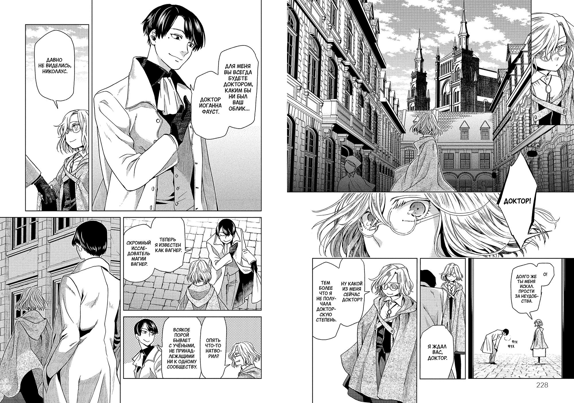 По воле случая Марион покидает родной дом и присоединяется к Иоганне в её странствиях, день за днём убеждаясь в том, что она неординарная женщина, воплощающая в себе то, что обычно вкладывают в понятие «Человек эпохи Возрождения». В одном из заброшенных селений, где можно пересидеть, пока на пятки наступают Инквизиторы, у Иоганны, оказывается, живёт дочь. Да не просто дочь, а робот, управляемый гомункулом! Такой вот неожиданный «фаустпанк». На этом фоне сама Иоганна раскрывается как персонаж неоднозначный и трагический. В наш дни авторы любят оперировать термином «серая мораль», который к указанной эпохе с её уровнем жизни, социальной раздробленностью и низким развитием науки и медицины подходит идеально. Как учёный до мозга костей, Иоганна стремится помогать людям. Как человек рациональный - понимает, что в обозначенных условиях всем помочь нельзя и нужно из двух зол выбирать меньшее. Есть, например, пшеница, которую местные жители могут посадить, вырастить, тем самым прокормив свои семьи. Это хорошо. Но есть «побочка», пыльца пшеницы, способная оказать негативное влияние на здоровье (вероятно, это местный аналог спорыньи, которая выкашивала в старые времена целые поселения). Сколько-то человек будут сыты. Сколько-то умрут. Спасти большинство, пожертвовав меньшинством правильно, но с этим бывает трудно смириться. И таких моральных дилемм у главной героини много. Будет ли у неё время разобраться с ними? Странный вопрос относительно человека, чьё бессмертие положено в основу сюжета. Но тут тоже есть нюанс: Иоанне периодически приходится сталкиваться со смертью, умирать на время, и каждый раз после воскрешения она становится моложе. Да, это одна из вариаций «Загадочной истории Бенжамина Баттона», и вначале в ней вообще не наблюдаешь минусов - ну какая женщина не хотела бы постоянно молодеть (особенно в возрасте 100+)? Сюжет, однако, всё расставит по местам и создаст ситуации, которые позволят взглянуть на этот процесс с другой стороны, подпитываясь фатализмом и непредсказуемостью человеческой жизни, финал которой не дано предвидеть никому. Мангака обязательно будет знакомить нас с новыми героями. Один из них - Вагнер. Тоже немец, но не композитор, а маг, создатель големов и гомункулов, преследуемый Церковью импозантный молодой человек с вечной улыбкой на лице. Он приятель Иоганны и им тут есть, чем заняться. Хотя на пути к заветной надписи «Продолжение следует» вполне вероятны ситуации, когда нужно будет объединиться не только с другом, но и с заклятым врагом. Маленькая инфернальная девочка с особыми кулинарными пристрастиями, это, знаете ли, противник, которого не стоит недооценивать. Однако, даже со всеми этими деталями Ямадзаки в визуальном плане предпочитает не жестить.