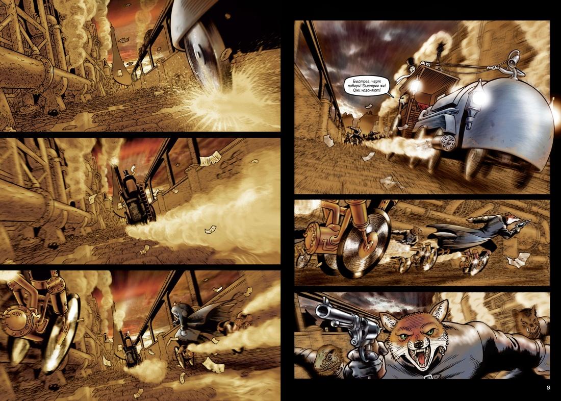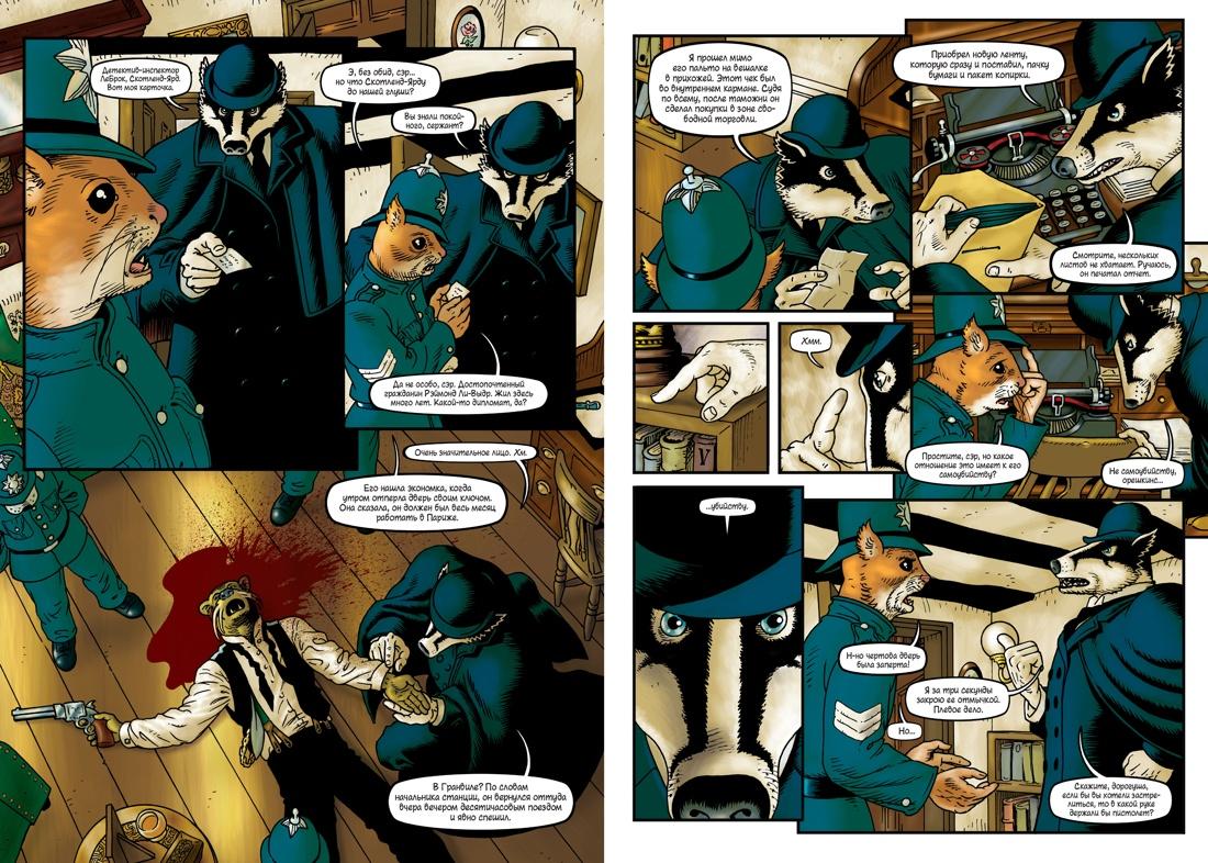 Что такое Гранвиль? Во вселенной комикса это большой город (собственно, так это название и переводится) во Франции, несомненно, имеется в виду Париж. Столица Империи, захватившей всю Европу и величайший мегаполис мира в принципе. Двести лет назад Франции покорилась и Великобритания, правда, через сто семьдесят восемь лет местные организовали Сопротивление, устраивали акции гражданского сопротивления и не без помощи анархо-терроризма вернули себе независимость, став Британской Социалистической Республикой. Звучит громко, но на деле это незначительная точка на карте Объединённой Европы. Стоит ли говорить, что в этой самой Европе британцев не очень любят, оскорбляют в лицо и даже отказывают им, например, в обслуживании на основании того, что «Все вы там сепаратисты». Тем не менее, Лондон связан с материком железнодорожным мостом через Ла-Манш, именно этим способом в Гранвиль попадают детектив-инспектор Скотланд-Ярда ЛеБрок и его помощник, детектив Родерик Ратци. Если что, ЛеБрок - барсук, а Ратци, как не сложно понять - крыса (не в смысле «предатель», он тут как раз постоянно выручает главного героя и разруливает ситуации с помощью своей заряженной патронами трости). У Тэлбота все персонажи не просто звери, взявшие на себя человеческие роли, их животные «обличия» и даже имена имеют в плане сюжета глубокий смысл, иногда подсказывая читателям то, что может произойти дальше, иногда запутывая их. У всего есть обоснование, взятое из книг, фильмов, артбуков, реальной политической истории Европы и, конечно же, комиксов. Если, к примеру, в кадре дерутся барсук и лис, то не только потому, что так захотелось автору… то есть, поэтому тоже, но захотел он так сделать, вдохновившись карикатурами на противостояние британских консерваторов-тори и либералов-вигов.