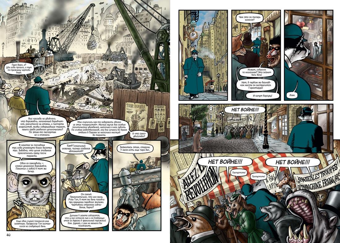 Вторая «серия» «Гранвиля» тоже начинается с классики: прямо из-под эшафота сбегает опаснейший маньяк, которого ЛеБрок поймал и засадил в тюрьму. Деяния Бешеного Пса очень напоминают «почерк» Джека-Потрошителя, это отвратительный и поехавший персонаж. Но пока он бегает по ночным крышам, залезает в дома и убивает женщин, ЛеБрок и Ратци идут по следу, тянущемуся почему-то опять в бордель, где недавно знатно погулял один клиент. Дело житейское, пусть и закончившееся для клиента печально, но в итоге веревочка сюжета распутывается в заговор государственного масштаба. Пожалуй, на этом хватит спойлеров, скажу лишь, что будет интересно, а обилие «намекающих» деталей вдохновит перечитать комикс разок-другой. Да, чуть не забыл: в «Гранвиле» присутствуют ещё и элементы стимпанка, тут даже роботы есть, похожие на послушные механизмы из очень старых фантастических фильмов. Рисунок детален, динамичен, цветовая гамма склоняется с тёмным оттенкам и полутонам, периодически «взрываясь» кровавыми пятнами и брызгами. Пока на фоне гордо реет британский флаг или красуются парижские красоты вроде Эйфелевой башни, Монмартра и Лувра. Они как раз выглядят привычно. Что непривычно, так это то, как Тэлбот обращается с персонажами, знакомыми всем буквально с детства. Что это за белый пёс в опиумной курильне, бредящий о крабах с золотыми клешнями и вспоминающий какого-то капитана Ходока? Что случилось с уткой Дональдом и медвежонком Винни, почему они выглядят как маргиналы и сидят за решеткой? Печально всё это. Но ещё более печальна участь людей. И они тут есть, их называют «тестолицыми» и считают за низшую форму приматов, тупых созданий, которым можно доверить самую простую и самую грязную работу. Короче, унтерменши. Хотя вот же, гостиничный лакей, служка, вполне себе смышлёный и наблюдательный паренёк, очень помогает ЛеБроку (уверен, вы угадали, что это Спиру), не такой уж и бесполезный и глупый.