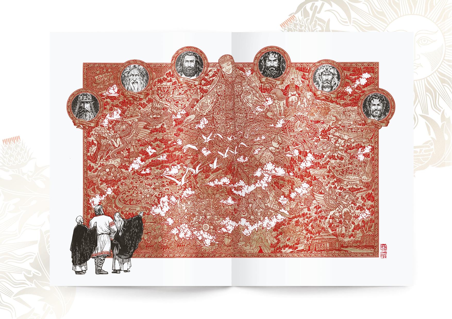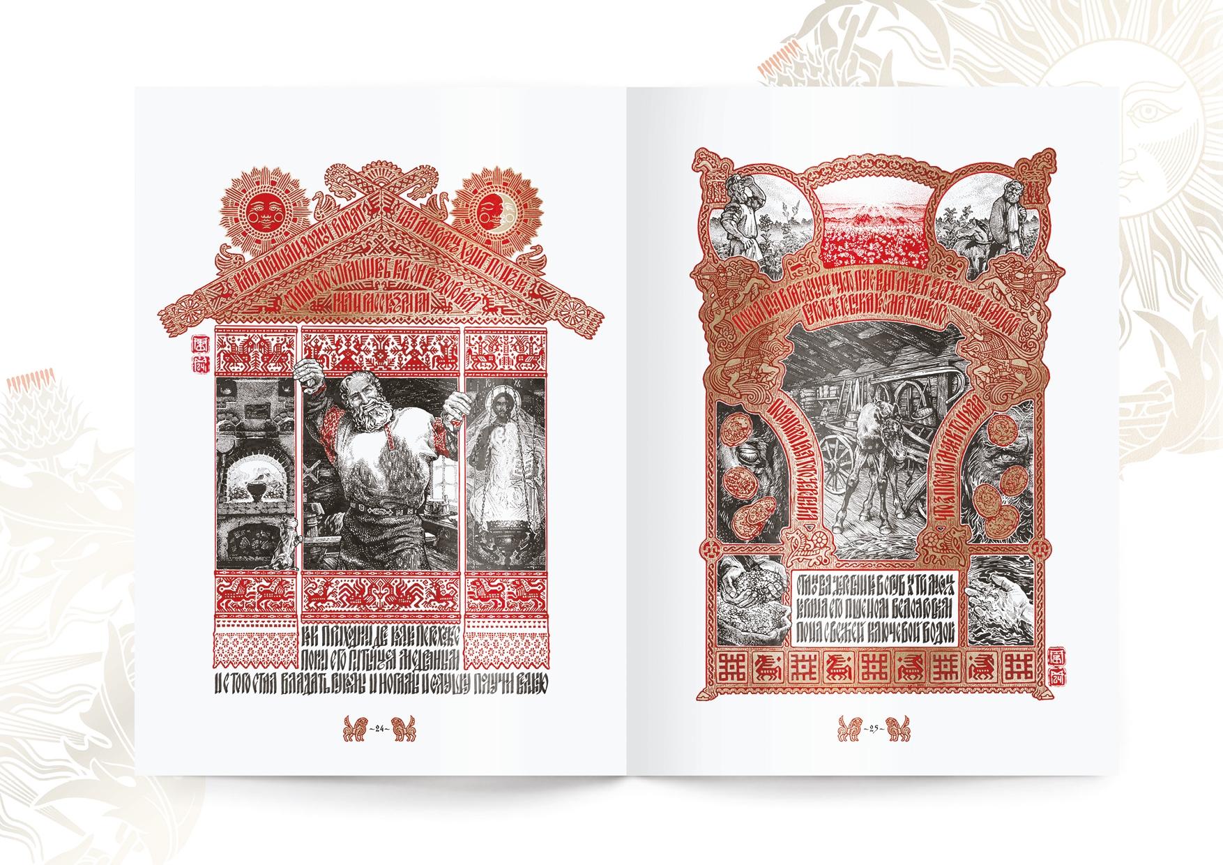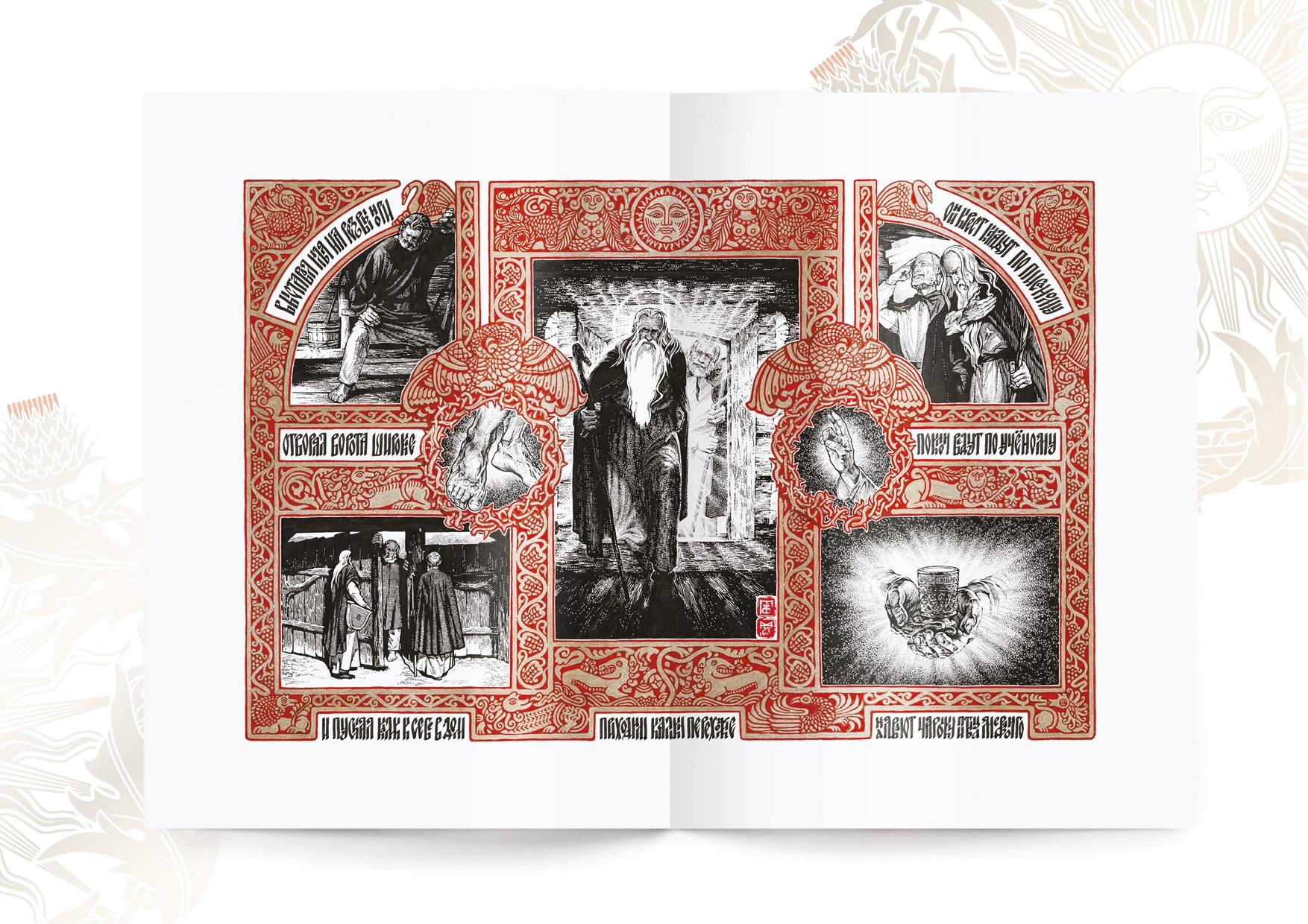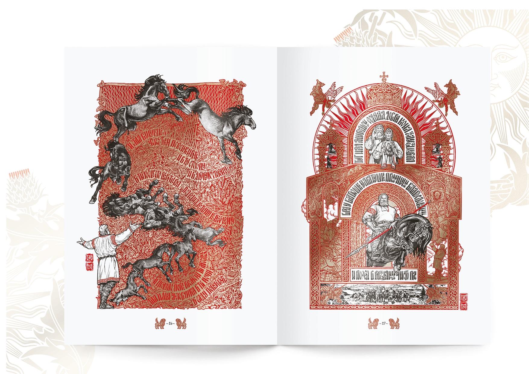 Художники к этой былине обращались не раз. Максим Кулешов, создавая свой «графический былинный сказ», ориентировался на великих мастеров прошлого, посвятив свою работу Ивану Билибину и Виктору Васнецову, и как бы принимая у них эстафету русского традиционного искусства. Книга состоит из оригинального текста и рукописного леттеринга, воссоздающего «древнерусский стиль». Странно, конечно, почему во всём мире восхищаются, например, искусством японских каллиграфов, развешивая по стенам нарисованные тушью иероглифы, а наша «вязь» букв как будто бы в тени находится, словно что-то архаичное. А, между тем, тут и гармония, и выверенная геометрия, и сложная ручная работа, требующая концентрации и терпения. И текст, написанный в этой стилистике, является неотъемлемой частью иллюстрации. У Максима вообще рисунок – это виртуозный симбиоз графики (чёрно-белой, максимально детальной, напоминающей гравюру), текста и обрамляющих всё это узоров и «оконцев», в каждом из которых также присутствует изображение, дополняющее центральный образ. Окошки с узорами могут содержать вариации древних изразцов с их природными мотивами, признаки лубочного стиля и элементы православной иконографии, и всё это зачастую представлено в красном цвете, сочетающемся с «настоящим» золотом.