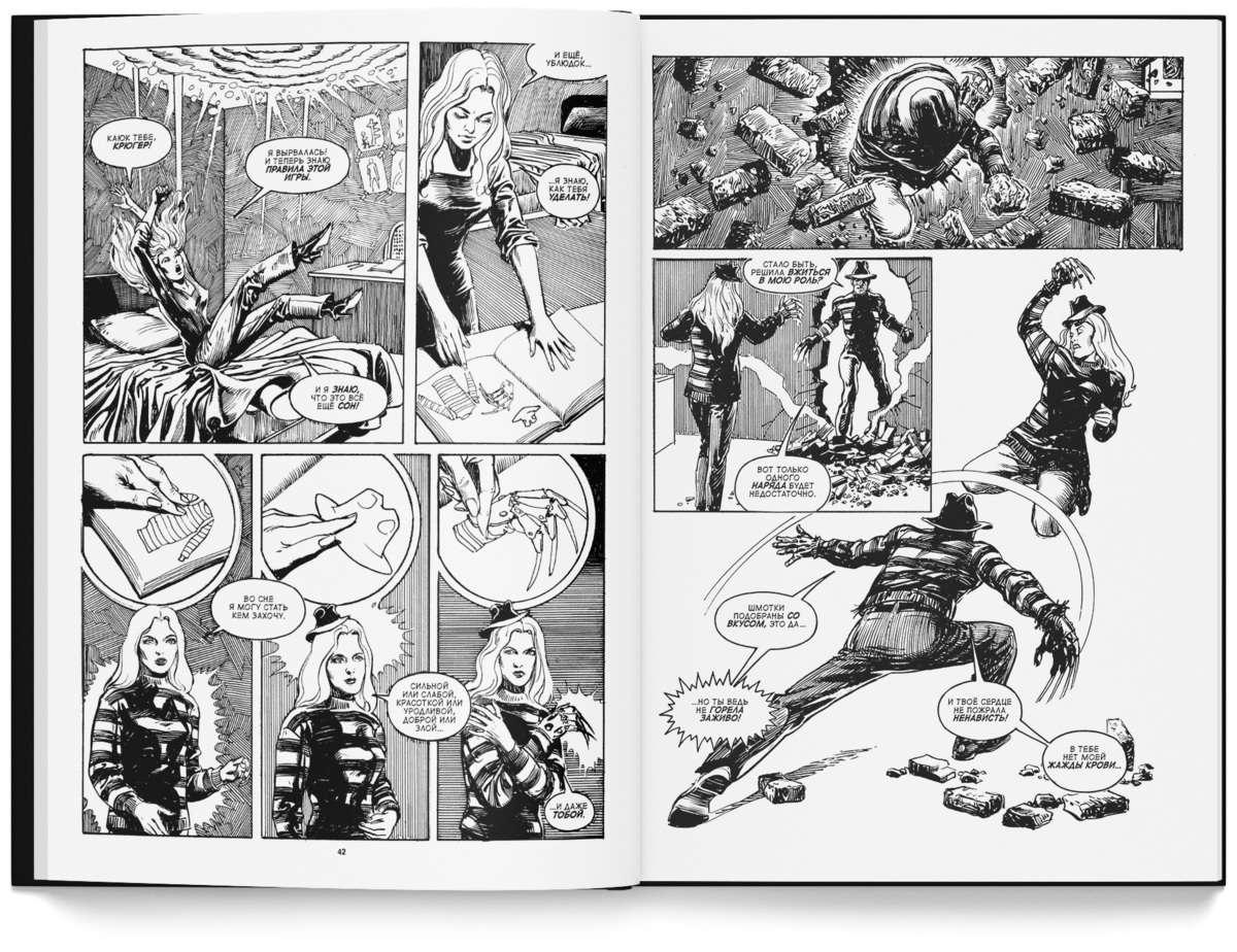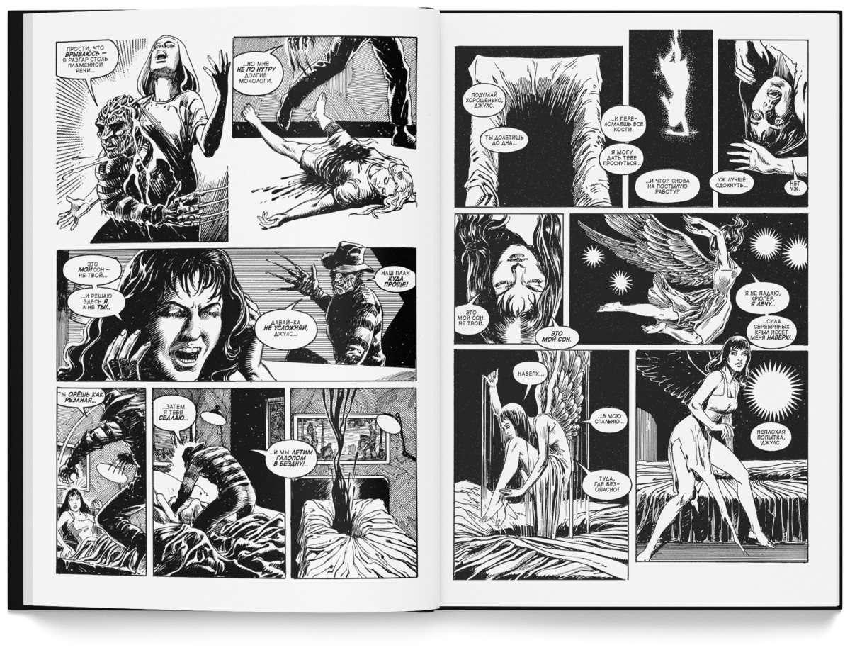 Одна из ключевых тем комикса может быть интерпретирована так: чтобы победить зло, нужно стать им, копируя его методы. Таким образом – спойлер! – знаменитый свитер примеряет не только Крюгер. Жаль, что эта тема не получила должного развития по причине резкого закрытия комикса, это можно было бы развить в интересном направлении. Данные же два выпуска демонстрируют превосходство формата комикса над кино, там, где не хватает бюджета и технологий, легко нарисовать всё, что тебе придёт в голову, с помощью карандаша и туши. Чем художники серии Тони Дезунига и Альфредо Алькала активно пользуются, делая мир контролируемых Крюгером сновидений ещё более опасным и сюрреалистичным. Сам рисунок напоминает палповые серии американских комиксов, у нас в России выходят, к примеру, антологии журнала «Крипи», вот тут можно заметить схожую стилистику. А ещё не лишним будет вспомнить о бесконечной европейской эпопее про Дилана Дога. На русском комикс вышел «неофициально», по схеме «для своих»: издатели из «Варгусь» называют эти книжки вознаграждением для спонсоров на краудфандинговой платформе и уверяют, что не несут никакой ответственности за то, что с этими комиксами будет дальше, захочет ли кто-то их продавать или нет. Издание, надо заметить, получилось качественным, видно, что делали с душой. Твёрдый переплёт, несколько лимитированных обложек. Формат 163*245 мм.