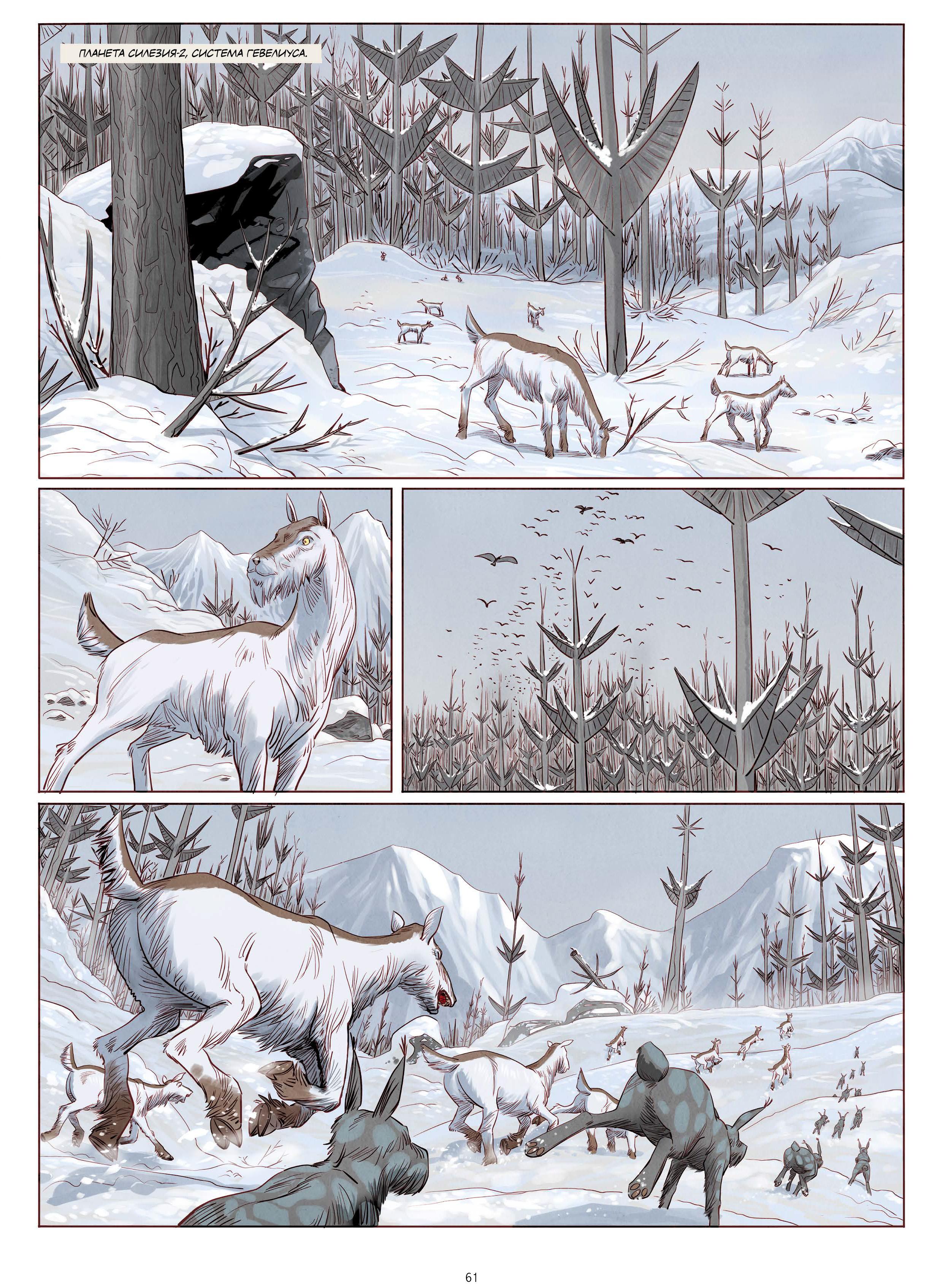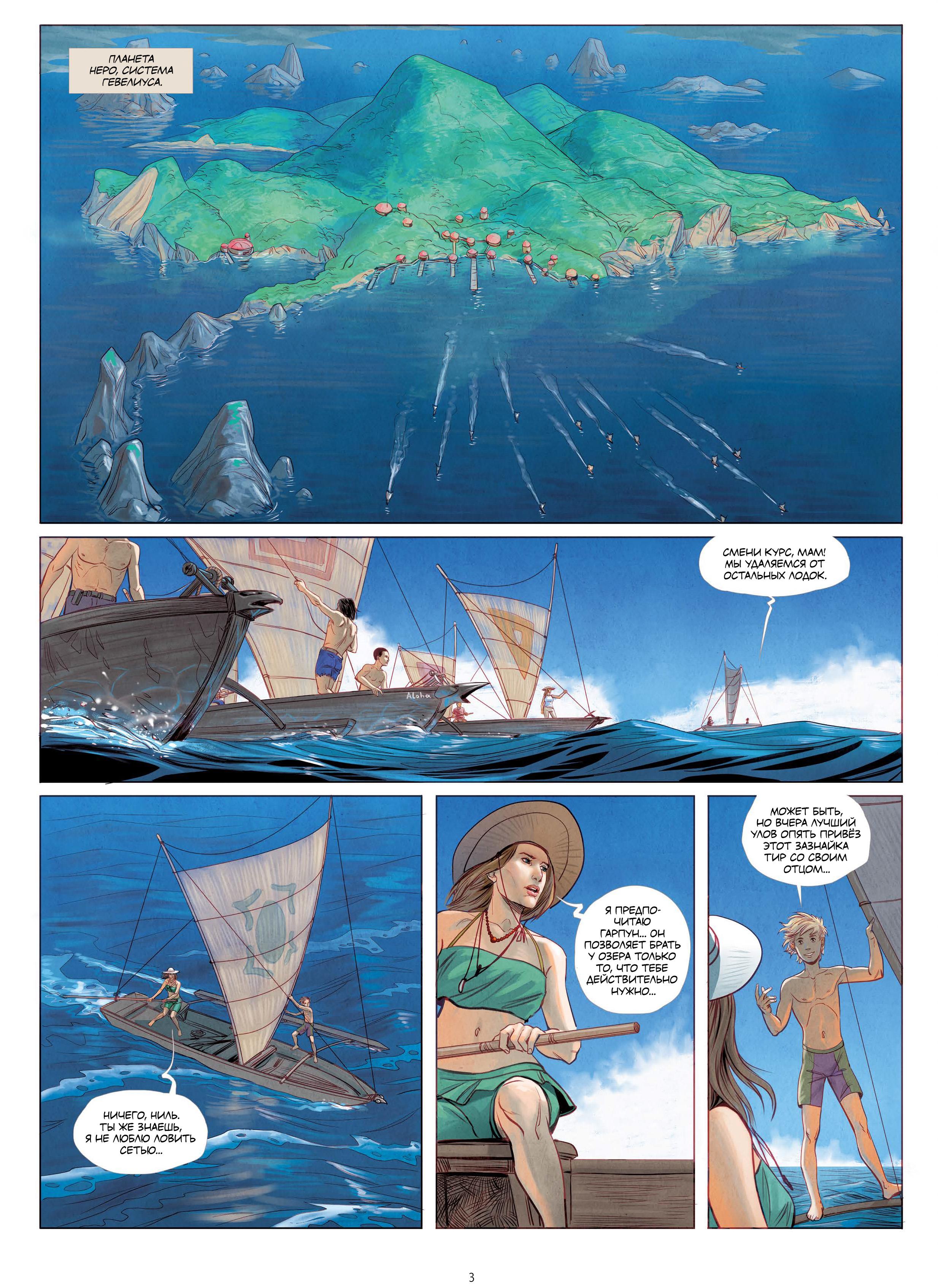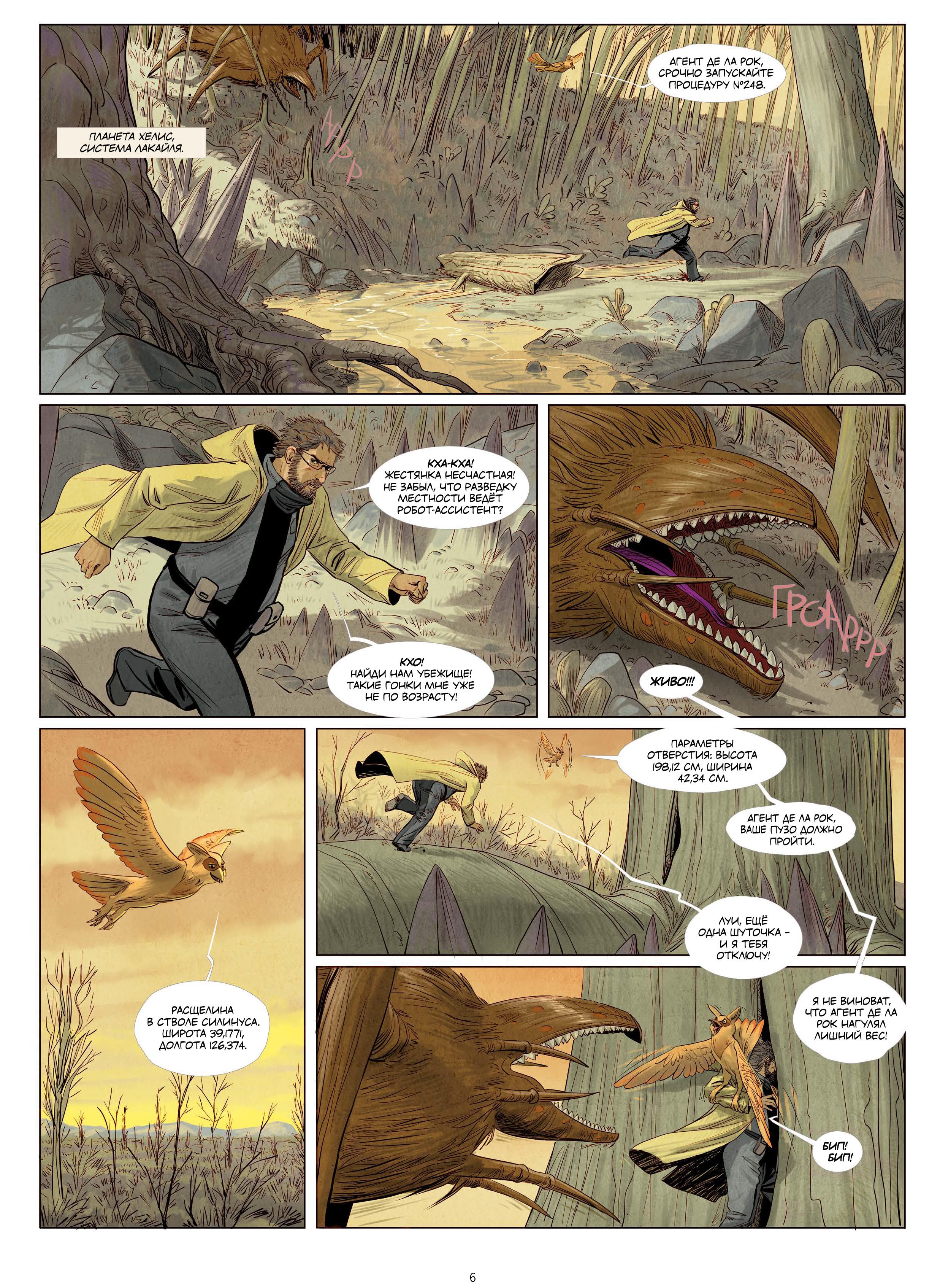 Одного из главных героев комикса зовут Бор де ла Рок, он оперативник со стражем, мужчина за чертой средних лет, с бородой, в очках и с признаками лишнего веса. Для выполнения очередного задания ему определяют в напарницы рыжеволосую красавицу Аннет Павлову, дочь влиятельных родителей, отправивших её в Контору на перевоспитание. Новоявленные напарники, конечно же, по законам жанра, первым делом поскандалили в кабинете начальника в стиле «Ничего не знаем ни про какую субординацию!», но уже к середине первого тома вполне себе поладили. Ведь Аннет, Анюта, хоть и мажорка, но внезапно оказывается умной, рассудительной, смелой девушкой, с которой можно и в огонь, и воду. Кстати, о воде. На планете Неро, что в системе Гевелиуса, происходят природные аномалии, связанные с местным океаном и грозящие уничтожить экосистему. Сразу же в начале хорошо видно то, за что лично я люблю комиксы Александра: сочетание рисунка, в котором есть что-то от советской «анимации» и книжной иллюстрации с намеками на увлечение аниме, и работа с цветом. Смотришь на океанскую гладь, на глубокие небесные оттенки, на песчаные пляжи, чуть коснёшься пальцами страницы, и вот прямо ощущаешь тепло воды, дуновение бриза, покачивание волн. Очень хорошо. Но водная идиллия в стиле «Аватар» продлится недолго, благодаря сюжетообразующему фактору Бор, Аня и их пернатый робот-помощник Луи (как по мне, очень похожий на птицу Говоруна) окажутся в пустынной местности, на планете типа Аракис. И всё эти внезапные телепортации как-то связаны с семьей Павловой и поисками лекарства от всех болезней. Интрига держится до конца, позволяя себе в итоге даже превратиться в стандартный боевик с беготнёй, как раз в стиле «Хакера».