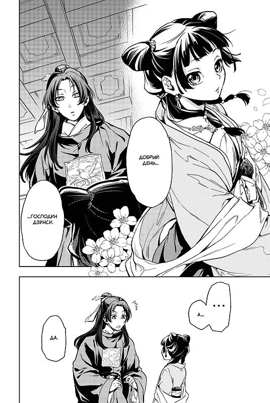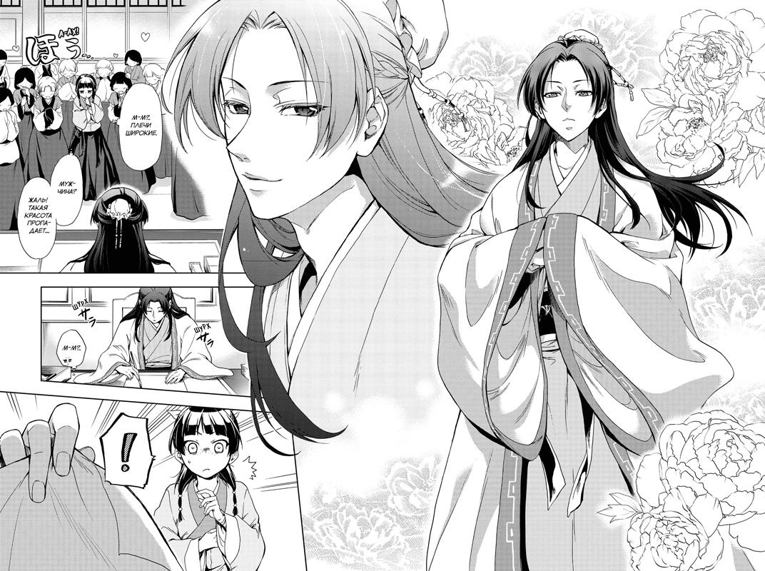 Маомао становится низшей служанкой во дворце императорских жен. Неприметная серая мышка, коих много, ещё и веснушки на лице. Смотрит иногда на первых красавиц государства и завидует тому, как природа их щедро одарила во всех местах (и вздыхает о том, что природа отдохнула на ней, не выдав даже желанного второго размера), особенно в области груди. Это не проявления озабоченности, если что, сами создатели манги на этом постоянно делают акцент, а художник ещё и подчёркивает данное обстоятельство. Но жизнь Маомао начинает меняться, когда выясняется, что новорождённые дети наложниц умирают, возможно, не от естественных причин. Да и сами жёны императора подвержены странным хворям. При чём тут Мао? Девушку воспитал её отец, специалист по лечебным травам и разным ядам, и его дочь оказалась достойным учеником. Мао тут как бы выступает в двух ролях, она и «увлечённый гик», и «чокнутый профессор». Мао знает, какие травы и снадобья могут исцелить, а какие - вызвать недомогание, аллергическую реакцию и смерть, причём не всегда быструю, а замаскированную под болезнь. Яды же вызывают у неё полный восторг вперемешку с научным интересом, поэтому Мао ещё в «доме цветов» активно тестила их на себе, принимая маленькие дозы, изучая воздействие, симптомы, вырабатывая иммунитет. Девушку с такими хобби встретить даже в наши дни непросто, при дворе же императора она производит шок, когда пробует отравленную еду, восторженно улыбается и требует «Ещё!».