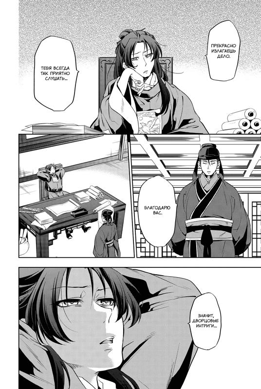 Маомао быстро идёт на повышение. Да и как иначе: разгадав тайну детских смертей и хвори родивших их жён, Мао спасает благородных людей от ядов и пищевых аллергий, которые кое-кто может использовать в своих целях. Попутно разбираясь в тонкостях придворного этикета (например, выясняя, почему все вокруг дарят ей дорогие шпильки для волос), что может оказаться не менее запутанной задачкой. Во втором томе манги Мао участвует в расследовании (само)убийства, и так втягивается во всё это, что даже поездка домой, к бабушке, перерастает в поиски виновника двойного отравления. Может быть, у вас уже созрел вопрос: «А при чём тут монолог?». Всё дело в методике, которую использует главная героиня: девушка в своём воображении расставляет все улики по полочкам, постоянно проговаривая свои действия, пытаясь выстроить правильную цепочку событий. И вот здесь и начинается детектив, причём настоящий, запутанный и интересный. Иногда авторы манги подкидывают улики читателям заранее, словно приглашая их присоединиться к расследованию, но обычно - у меня уж точно - это вызывает реакцию «И как я сам этого раньше не заметил?». В целом это увлекательно, и если вы любите разгадывать детективные головоломки, то тут есть, на что посмотреть. Постепенно череда происшествий и связанных с ними улик начинает складываться во что-то более сложное и глобальное, чем просто тайные разборки за передел сфер влияния во дворце, а там уже и выясняется, что с этим как-то связаны близкие Мао. Интрига? Однозначно. Как гласит правило, в расследовании главное не выйти на самого себя.