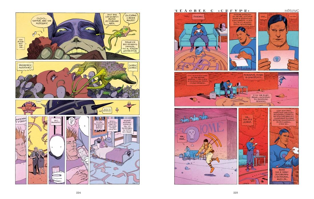 Версия со сном в метро, конечно хороша. Мёбиус тоже поддерживает «сновиденческую природу» придуманной им реальности. Но у изящного финала с севшим в вагон Губертом есть продолжение, которое Жиро создал в 1994-м году. В «Человеке из «Сигури»» майор таки выходит из подземки и оказывается в мире, очень похожем на наш. Лишь с некоторыми изменениями. В этом мире есть книга некоего Л. Учника, в ней описаны события, происходившие в «Герметическом гараже», и теперь Груберту нужно найти её автора, чтобы вернуться домой, к Мальвине, ждущей его на «Сигури». Параллельно с этим читатели будут наблюдать за миссией Оры Бармагу и его спутника, и тут стоит сказать, что Мёбиус как бы повторяет сюжетные линии Барнье и Лучника. За исключением того, что Ора тут рассекает по кадрам голым, но, спасибо Жиро, без приступов приапизма. Логичное завершение истории - не то, за что боготворят Мёбиуса, но тут она точно кажется незаконченной. Времена оказались другими, от Мёбиуса ждали другого… тираж «Человека с «Сигури» потом ещё долго пылился на складе издательства. Не уверен, что «Гараж» нуждался в продолжении, но оно есть.