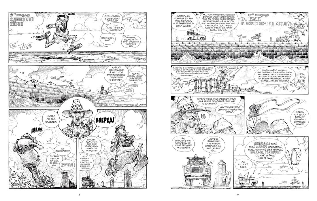 Но, прежде чем переходить к «Гаражу», рассмотрим единственный комикс в сборнике, вроде бы не имеющий к Груберту никакого отношения. «Ретивый стоялец», так зовут главного персонажа, представляющего собой классический тип «Маленького человека, попавшего в большую историю». Человек-то, может быть, и маленький, но вот мужское достоинство у него - ого-го, добавьте к этому постоянные приступы приапизма, и вы поймёте, почему за этим тщедушным мужичком охотятся сильные миров сих, требуя от него размножаться и плодиться. Иначе катастрофа. Комикс - типичный для Мёбиуса космогротекс, он же стёб над каноничными космооперами, действие раскидано на несколько миров и сюжетных линий, следуя которым вы должны будете сами догадаться, что и с кем тут происходит, пытаясь расшифровать инопланетные термины и понять логику этого мира. Знаете, на что это похоже? На фильм «Кин-дза-дза!», захотелось даже узнать, а не листал ли Георгий Данелия журналы с комиксами Мёбиуса? Есть здесь и узнаваемый юмор Жиро, как правило, с ехидным социальным подтекстом, в наличии пересечения, смысловые и визуальные, с другими работами француза. Например, тема космической любви, ей предаются в «Финальном Инкале», также демонстрируя её созидательную, всеобъемлющую силу. При этом сам комикс в книжной раскладке занимает только правые страницы. На левых страницах в череде кинематографических кадров угрюмый мужчина, смотрящий прямо на вас, медленно превращается сначала в нечто аморфное (жители Москвы воскликнут «Да это Глина №4!», и в чём-то будут правы, у меня это была первая мысль), а потом трансформируется в яйцо, вынашивающее в себе… пустоту? Сам по себе этот визуальный приём также напоминает графроман «Глаз кошки», созданный Жаном в тандеме с Алехандро Ходоровски. А ещё тут Мёбиус играется с жанрами, вырывая героев из космооперы и бросая их то в пиратское приключение, то в аристократический детектив.