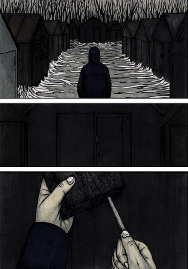 Мытищинский (по месту действия) ретро-хоррор (по сути) «Отверстия» от Civetadei Art и Германа Шендерова, выпущенный в свет издательством «Панцирь комикс», напрямую обращается к тем, чьё детство пришлось на девяностые, пробуждая воспоминания о типичной атмосфере среднестатистического подмосковного промышленного «спальника». Воспоминания эти, в одной стороны, стабильно вызывают ностальгию: вот тут мы крутили (ладно, старались крутить, получалось лишь у самых отчаянных) «солнышко» на скрипучих качелях во дворе, вот на «радость» соседям жгли там же костры, кидая в них аэрозольные баллоны и что-нибудь типа шифера. С другой стороны, в этих фрагментах памяти есть много такого, что хотелось бы забыть. Обычно это люди и их судьбы, с коротким, как черточка между годами жизни, финалом: спился, умер от цирроза, удавилась, пропал без вести, вскрылся… Стандартный, в общем, набор ситуаций, окружавший тех самых детей девяностых. То есть, всегда как будто существовал жесткий контраст в жизни молодого и ничего еще не понимающего в развалившейся стране поколения. Вот тебе возможность шариться за гаражами, тусить с друзьями допоздна и случайно вырывать у реальности редкие и недоступные ранее ништяки вроде карт с голыми женщинами. А вот череда смертей людей, которых ещё вчера ты видел у своего дома. И это тихие смерти, какие-то обыденные, если и попадавшие в твое информационное поле, то только благодаря тихим разговорам родителей на кухне под бухтящее радио: «Этот то, со второго подъезда… Да ну... Представляешь… Ужас какой…».