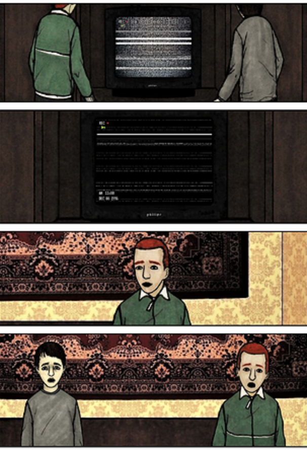 Главный герой комикса, парень по имени Антон, однажды почти что стал персонажем этих кухонных откровений: поход с отцом на зимнюю рыбалку чуть было не обернулся трагедией. «К счастью» (дочитавшие поймут, зачем тут кавычки), беды удалось избежать, но происшествие сильно сказалось на здоровье парня. Антон болеет и вынужден сидеть на домашнем обучении, пока его родители ходят на работу. Но у него есть друг Мишка, который может зайти в гости. Мишка – это вроде как подросший герой рассказов Николая Носова, он деловой, активный, во всём разбирающийся подросток, мотивирующий своего чуть менее бойкого другана на разные действия. Только если у Носова герои варили кашу, то здесь они ищут «ту самую» видеокассету без наклейки. Потому что у всех, у кого в девяностые был видеомагнитофон, была такая кассета. Поиски увенчались успехом, но вместо ожидаемой «малинки» и «клубнички» подростки увидели… нечто, выходящее за все рамки нормальности. Никаких сомнений в том, что это не постановочное кино, реальность происходящего ужаса подтверждается наличием в кадре хорошо знакомого человека. Привычный мир распадается на части. Истории о маньяках и их зверствах становятся частью повседневности. Что делать подросткам? Бежать к гаражам? Перемотать кассету на то место, с которого начали просмотр, чтобы не запалиться? Вглядываться и дальше в страшные кадры, пытаясь разглядеть что-то в кровавых дырах? Что-то, что перевернёт всю жизнь…