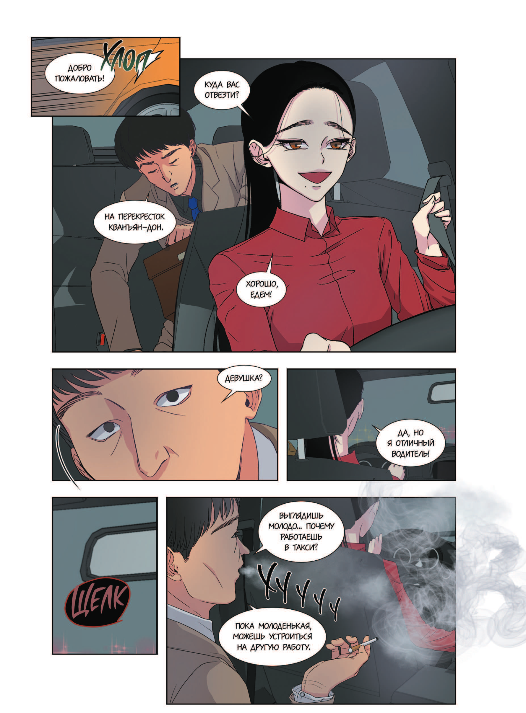Да, вот так всё и начинается - с чемодана, точнее, с его содержимого. И, надо сказать, это подстава для Хан Чэ А. Да, в мире этого корейского вэбтуна наверняка существуют камеры наружного наблюдения и видеорегистраторы в салоне, так что, по идее, девушка могла бы из неприятной ситуации благополучно вывернуть, но паника и груз в виде тюремного срока (логичная мысль «Да кто поверит бывшей осужденной?!» первым делом приходит в голову героине) делают своё дело. Хан ведётся на поводу у Пака, следует его указаниям и в результате затягивает себя в безвыходную ситуацию ещё сильнее. Теперь, чтобы не сесть снова, девушка должна выполнять требования Юн Су, а они у него простые: раз в неделю нужно привозить случайного человека по указанному адресу. Можно возмущаться, можно попытаться сбежать, можно включать свой характер - это ничего не изменит. Человек всё равно сядет в машину Хан и она его повезёт. Но за малейшее ослушание девушку ожидает какое-то прямо мистическое преследование со стороны Пака, от которого нельзя нигде спрятаться. Машина теперь - не убежище, не место, где можно закрыться от внешних опасностей; в атмосфере ночного мегаполиса, так тщательно выстроенной Хэмури, создателем данного вебтуна, салон постепенно превращается в ещё одну причину для панических атак и приступов клаустрофобии. И для истории, строящейся на постоянно нагнетаемом саспенсе, это отлично.