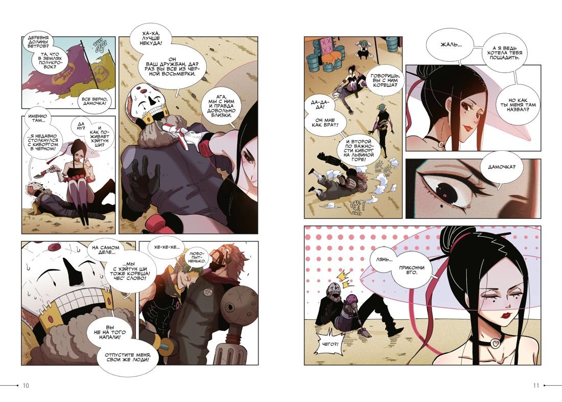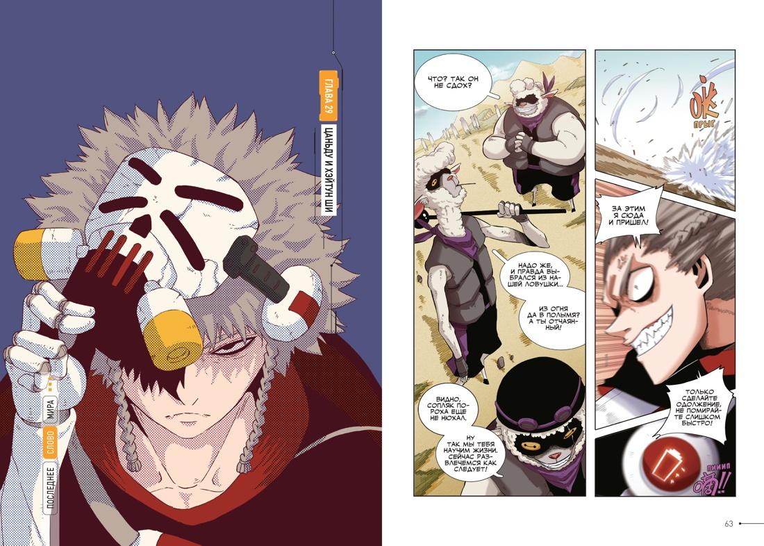 Мехакрепость, её хозяин (похожий на кого-то из компьютерных игр про Соника) и бараны-отморозки… Третий том сразу же выдаёт вам всё, что нужно знать о чувстве юмора Чэнь Си. И это чувство юмора отменно работает. Во-первых, бараны реально оказываются… ну, баранами. Во-вторых, они могут внезапно начать прыгать через забор, а Хэйтун Ши может начать проваливаться в сон, считая по привычке белых прыгунов. И это уморительно. При этом на протяжении всех первых глав третьего тома в голове вертится какое-то название из двух слов, что-то очень популярное… точно, «One Piece»! Словно порции абсурдного юмора автор и странных персонажей «ПСМ» черпал прямиком оттуда. Но маньхуа будет не только развлекать и веселить. По пятам Хэйтуна идут двое наёмников из Чёрной Восьмерки, группировки, олицетворяющей в этом мире зло. Сам Ши тоже является членом этой Восьмёрки, но его новым знакомым знать об этом необязательно. Так вот, эти наёмники далеки от гуманизма, предпочитают добывать информацию всеми возможными, но в массе своей максимально жестокими способами морального воздействия. Опасности подвергаются милые создания, которые только недавно встречали героев с теплотой и отзывчивостью, это подогревает драматический градус повествования, ведь тут приходится переживать уже за знакомых, симпатичных и очень человечных персонажей.