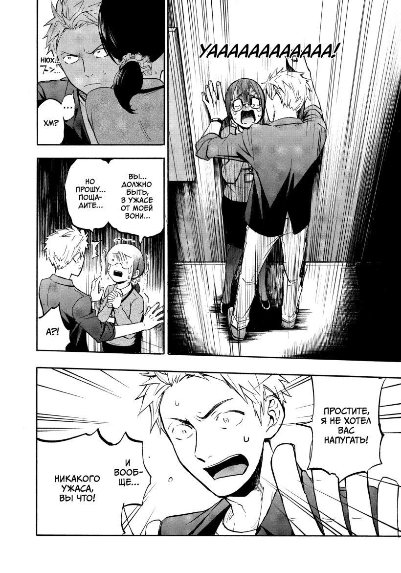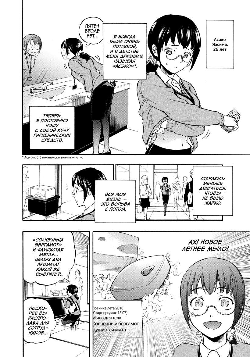 Феромоны - уловка маркетологов. Они точно есть у животных, но их наличие у людей не доказано, так что яркие парфюмерные пузырьки с запахами, «которые точно сделают вас привлекательными и желанными», не работают, т.к. используются в них феромоны животного происхождения (наверное, поливаться этим парфюмом перед походом в зоопарк не стоит). Тем не менее, естественный запах тела играет большую роль в коммуникациях, в том числе романтических, между людьми. Этот запах индивидуален, содержит различные компоненты и может меняться от множества факторов, к которым относятся возраст, настроение, обмен веществ и гормоны, так что да, наши тела передают в окружающее пространство сигналы, способные стать для окружающих маркерами, вроде «Да» или «Нет». «Мне нравится, как ты пахнешь» - интимное признание двух находящихся в очень близких отношениях партнеров. «Мы с тобой на одной волне» - возможно, это признание из той же серии, из мира парящих в воздухе запахов. Однако, развитие общества заставило нас с запахами тел бороться. Неприятные запахи стигматизируются, все остальные ловко перебиваются тоннами косметических и парфюмерных средств. Но иногда даже этого мало. Повышенная потливость вообще головная боль для многих людей, вызывающая стресс, чувство дискомфорта и неуверенность. Вот и для главной героини манги Кинтэцу Ямады, бухгалтерши Асако Яэсимы, усиленная работа собственных потовых желез превратилась в огромную проблему. Асако уже двадцать шесть лет, а у неё до сих пор не было ни с кем отношений. Каждый день она принимает душ по нескольку раз, наносит на свое тело антиперспиранты, обтирается влажными салфетками, использует ароматизированное мыло… и все без толку. До определённого момента, конечно.