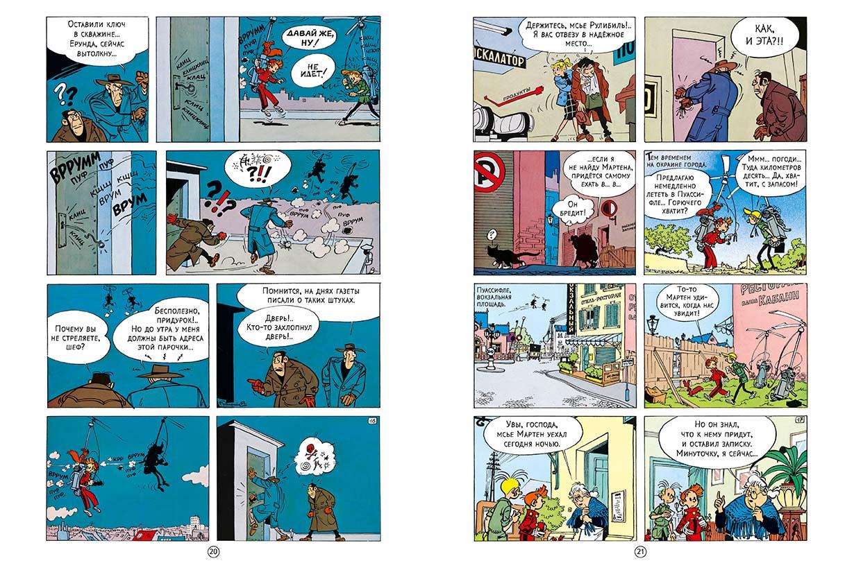 Надо отдать должное, Франкен умел сочинять простые, но весьма непредсказуемые сюжеты, позволяющие ему провести героев от ночного европейского универсама к бескрайним просторам Чёрного Континента. Плюс художник выстраивают свою собственную «спировселенную», в которой то и дело пересекаются не только персонажи, но и предметы (коптеры, гоночные машины, газеты), регулярно давая повод вспомнить про более ранние выпуски этой серии. Это интересно, а если и кажется наивным, то только в самом хорошем смысле. Четвёртый том «Приключений Спиру и Фантазио» вышел в издательстве «Мелик-Пашаев». Твёрдый переплёт, формат 290х217мм, 64 страницы, тираж 3000 экземпляров. Перевод Михаила Хачатурова.