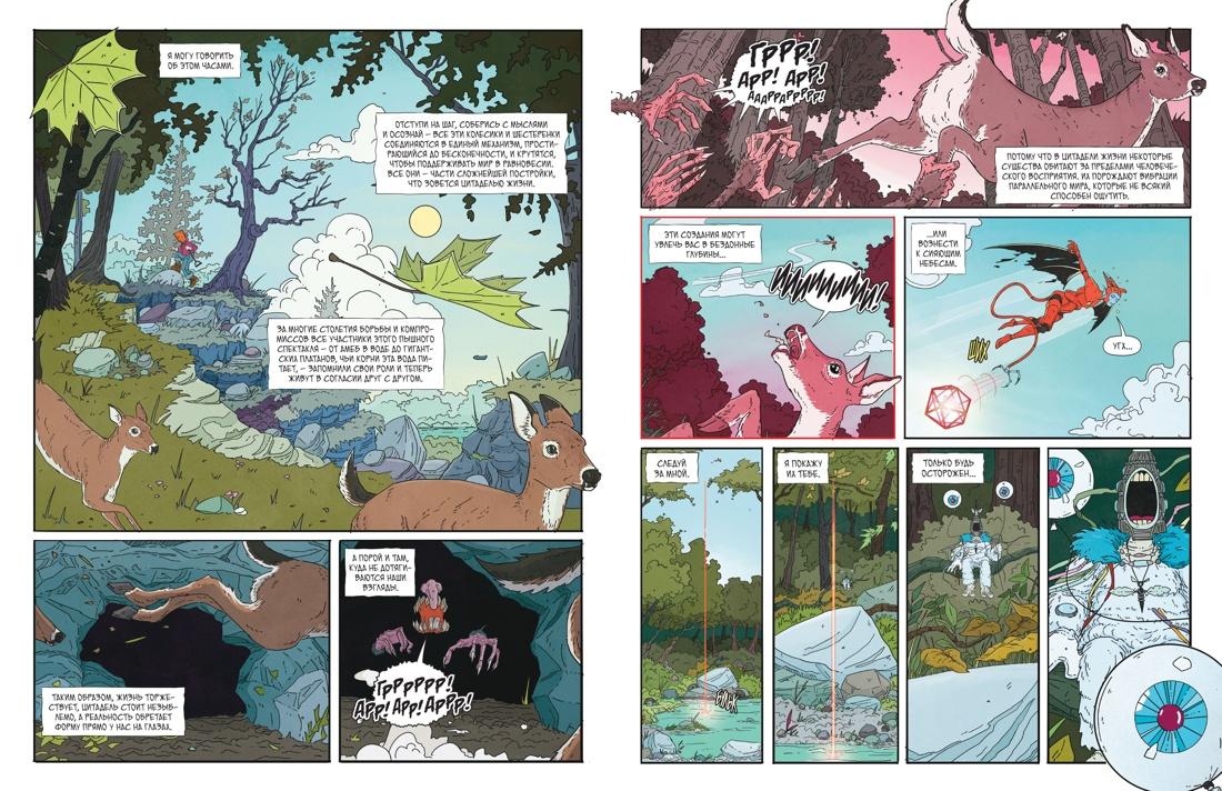 Действие комикса происходит в лесных окрестностях Филадельфии, где до поры, до времени действует правило: гёдели прекрасно осведомлены о существовании людей («великанов» по их меркам), а вот людям о лесном народце знать не положено. Хотя бы потому, что гёдели живут в параллельном измерении. Но однажды… ох уж это сюжетообразующее «однажды»… Гаулитрот встречает девочку по имени Лемюэль и мало того, что она его видит, так он, в силу магических обстоятельств (ведь в мире гёделей всё построено на магии) оказывается её должником. А долг надо обязательно вернуть. Так в комиксе появляется ещё один главный герой, темнокожая девочка-аутсайдер. В школе её буллят («крутые» девчонки обзывают бегемотихой и насмехаются над тем, что она читает детские книги), подростковый возраст диктует свои права, но больше всего Лемми переживает из-за Орешка, её пса, который потерялся. Объявления с его фото расклеены по всем столбам на районе, но от них столько же пользы, сколько от проникновенных молитв Высшему Существу с просьбой помочь найти любимца - то есть, никакой. Может быть, странное маленькое создание, похожее на мухомор, только ей померещилось на стрессе? В самом финале первого тома Оливер Блай внезапно выдаёт неслабый твист, а до этого просто и убедительно показывает житие-бытие американской глубинки. В окрестностях которой, повторюсь, творится самая настоящая магия. Не всегда, надо заметить, добрая, тут есть сцена с котом, допускающая, что природное равенство и гармония – это прекрасно, но иногда сильнейший делает всё, что считает нужным, не сильно беспокоясь о равновесии окружающего мира. Хотя нет, на самом деле только о нём и беспокоясь, просто иногда способы достижения этого равновесия выглядят… жестоко, да. Жизнь так устроена. И эту жизнь в её очень разных проявлениях Блай изображает с помощью яркого, детального и во многом экспериментального рисунка, в котором легко углядеть черты и американской «альтернативы», и классики франко-бельгийских комиксов. Оливер постоянно ищет новые визуальные решения и ракурсы: то разделит страницу на разлетающиеся, словно зеркальные осколки, кадры (что очень напоминает работы Фрэнка Куайтли), то «изменит» точку зрения и заставит читателей смотреть на всё глазами случайного персонажа, например, владельца магазина, лица которого мы так и не увидим. Заметно, что Блаю очень нравится рисовать придуманный им мирок гёделей, и персонажи ему по душе (даже те, которые выглядят, ну, не знаю, как куски свалявшегося меха, которые подобрал жук), и местная магия тоже интересна (воспринимается она, кстати, совсем как психоделические образы из «Инкала» Ходоровски/Мёбиуса, логично дополненные кислотными оттенками). Нравится Оливеру и придумывать для этого мира странно звучащие слова и термины, например, «Эссикриссический прыжок». И с неподдельной любовью воссоздается на бумаге повседневный быт маленького народца. Иногда даже кажется, что некоторые моменты «чуть» затянуты, например, шутка про пиво из бабочек, повторённая в той или иной вариации много раз. Но это как раз способ показать характеры второстепенных персонажей, раскрыть их перед читателями.