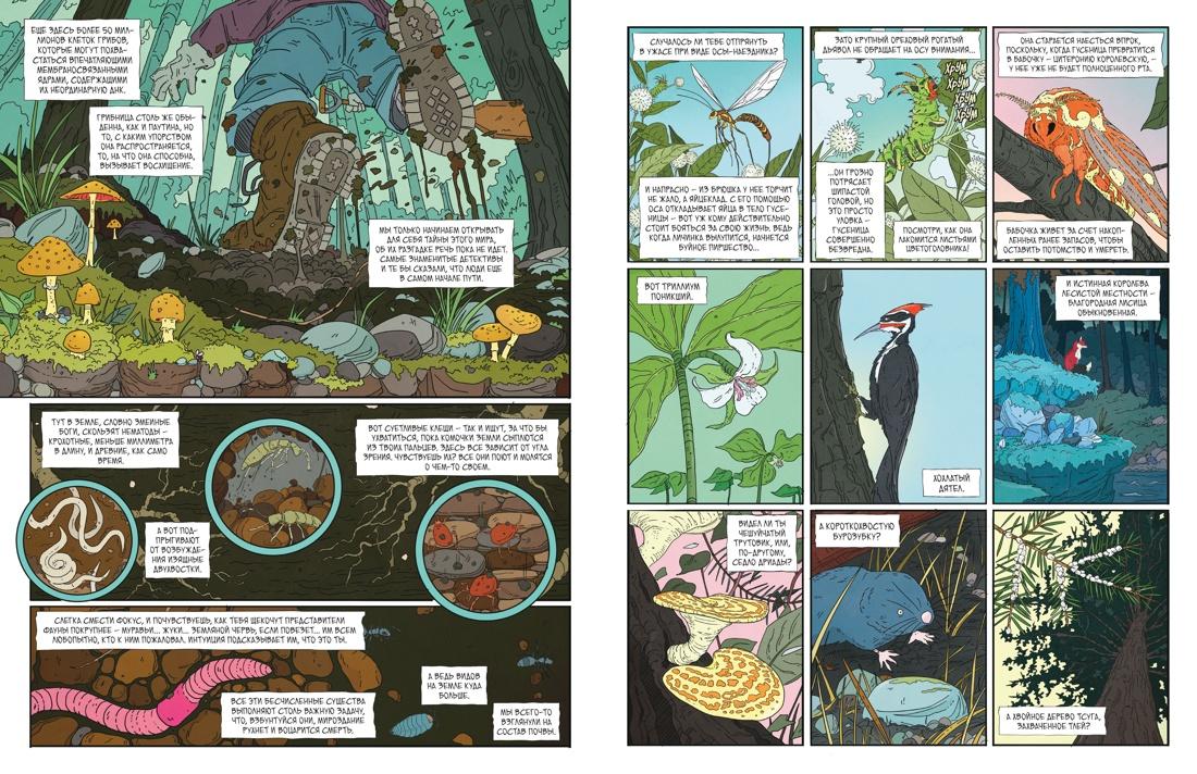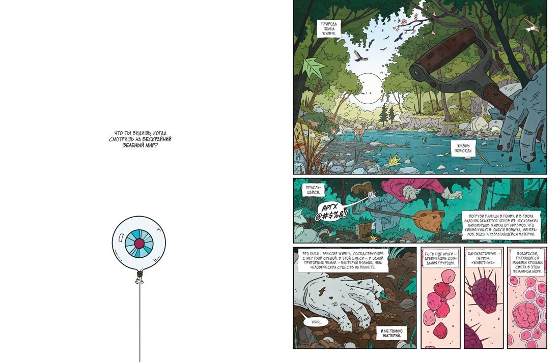 Комикс миколога и художника Оливера Блая начинается с лекции по биологии, точнее, с увлекательного рассказа о микромире. Археи, одноклеточные, водоросли, насекомые, грибы - и всё это в горсти мягкой лесной земли, умещающейся в ладони. Жизнь повсюду, вот основной постулат пролога, после которого даже давно окончивший школу читатель подумает: «Эх, вот бы в таком формате проходили у нас уроки по окружающему миру!». Буйство жизни действительно показано превосходно, но вот только в кадрах пролога периодически кто-то бегает по лесной глуши с лопатой, создавая ощущение нервозности. Явно же происходит что-то странное, если не сказать больше… что-то, с последствиями чего, вероятно, придётся разбираться по итогу триллионам перечисленных микроорганизмов.