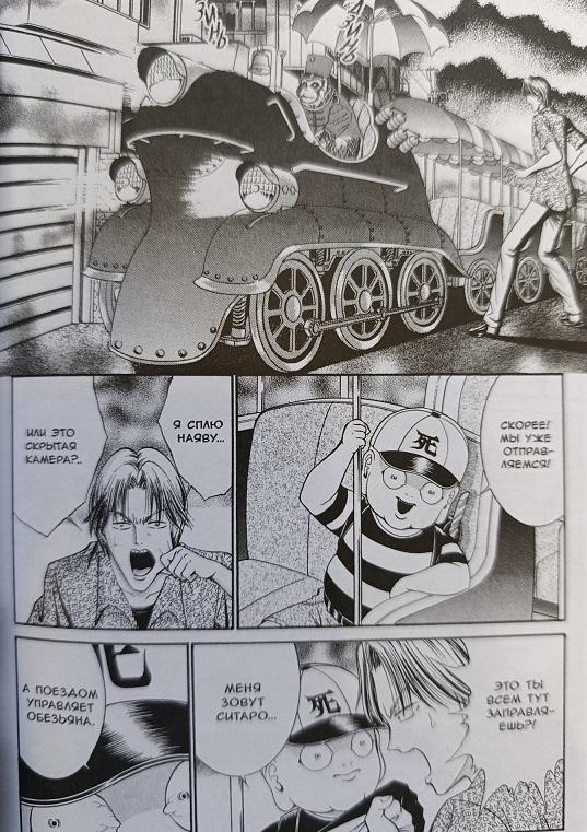 Четвёртый том продолжает эту вакханалию хоррора уже упомянутой историей про людей-медуз, после чего уходит в формат «городских легенд», которые могут быть не только пугающими, но и абсурдными. Например, среди героев одного рассказа ходит такая байка: ночью по городу ездит обезьяний экспресс, паровозик с вагончиками, как в торговых центрах, только катаются там приматы. А если какой человек сядет в вагончик, то тоже превратиться в обезьяну, такая вот обратная революция. В другой рассказе Ситаро как раз выступает - вместе с другими персонажами – в роли мотивирующего наставника. Три школьных подруги хотят научиться плавать, но у одной из них детская травма (однажды она повстречала каппу, который чуть не утащил её на дно), а другие подыскивают дешевый вариант бассейна. И однажды – находят. Плавать их точно научат, правда, на этом фоне померкнут все семейные байки из серии «Батя бросил меня в воду и я поплыл!». В другой истории Ситаро помогает юноше, снявшему по выгодной цене квартиру, в которой все предыдущие постояльцы кончали с собой, избавиться от призраков, сводящих бедолагу с ума по всем канонам жанра «Дом с приведениями» … пока соседи из дома напротив просто ждут, когда очередной несчастный повиснет в оконном проёме. А под конец Ситаро вообще берёт на поруки школьника-неудачника Ниномию. Парнишка то подводит школьную команду перед важнейшим соревнованием, то грозит сорвать театральную постановку по «Питеру Пэну». Не со зла, конечно, просто потому, что слаб, не уверен в себе. Что ж, у Ситаро есть способы сделать из него настоящего спортсмена и актера – помогут статуя в школьном дворе и астральные путешествия. Это должно вдохновлять и мотивировать, но, когда школьники отправляются толпой в астрал, закрадывается мысль, что они всё же умерли.