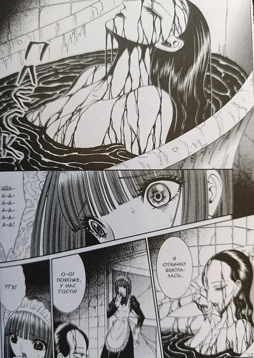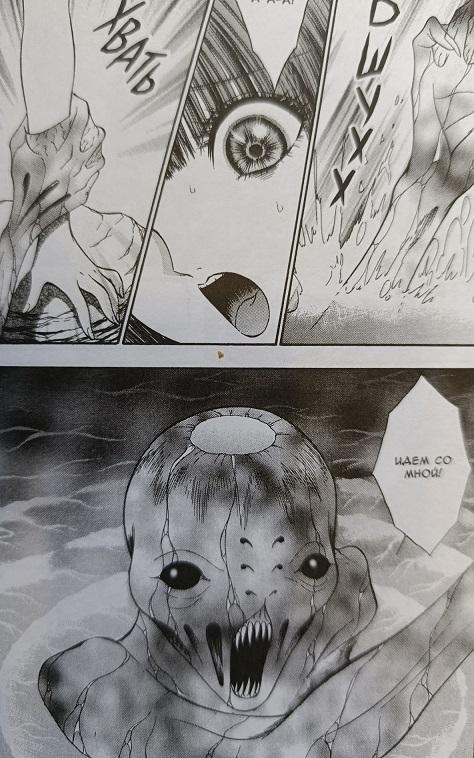Чем хорош Сенно Найф? Он берёт стандартные жанровые клише, добавляет к ним в огромных количествах другие клише – и в итоге получает нечто непредсказуемое, когда начало истории совершенно не даёт намеков на то, во что всё выльется в конце. Вот, например, открывающий третий том рассказ «Зов моря». Семья – папа, мама, дочка – приезжают в заброшенную гостиницу на морском берегу. Да, уже можно вспомнить сотню аналогично начинающихся историй и подумать: «Ну, понятно, сейчас приведения вылезут или подводные чудища». Папа и мама находятся в глубоком кризисе (отражение краха японской экономики девяностых?) и решают, что вынести этого они уже не смогут. Поэтому, пока их дочь купается, они распутывают веревки и завязывают узлы. Тем временем к гостинице подъезжает группа типичных подростков. И тут самое время снова подумать: «Ну, теперь точно всё понятно». Но мангака начинает крушить клише с помощью клише, он подкидывает очередной «Вот это поворот!» буквально через страницу. Медузы, ожившие «мертвецы», склизкие руки, хватающие купающихся в зелёной морской глубине, зомби… и все это перерастает в бади-хоррор с пухлым Ситаро, который беззаботно плещется в надувном круге. Это, определённо, безумная история. И смешная. Описанные здесь события настолько увлекли автора, что чуть позже он нарисовал продолжение, рассказ «Люди-медузы», вошедший в четвёртый том. Здесь уже под раздачу попала классика про «Нашествие похитителей тел», пугающая атмосфера недоверия ко всем окружающим (потому что они уже могут оказаться «не такими», носителями смертельной опасности) передана в полной мере.