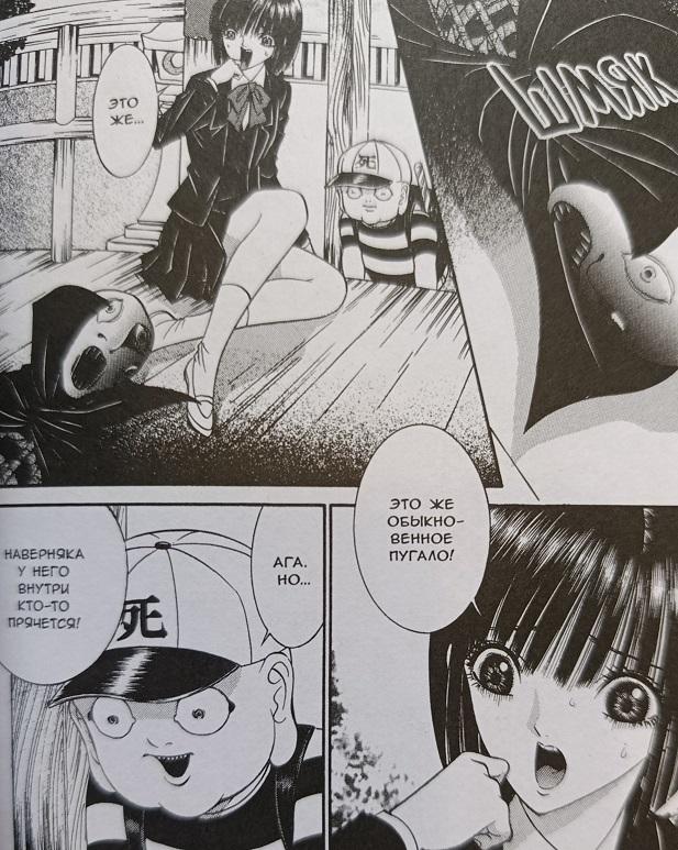 А знаете, этот парнишка Ситаро-кун, пухляш с большими глазами, в которые лучше пристально не всматриваться, вовсе не выглядит таким уж демоническим и злым, как это могло показаться после прочтения двух предыдущих сборников манги Сенно Найфа. Паренёк определённо «свой человек» в мире потустороннего и у него есть точные «инсайды», где, когда и с кем случится нечто необъяснимо-страшное, но, оказавшись на месте очередного происшествия, о котором будут складывать городские легенды (если будет кому это делать), он расценивает всё это как игру, забаву, и четко понимает, что окружающие могут пострадать. И иногда Ситаро не даёт этому случиться, спасая очевидных кандидатов в свои друзья от не менее очевидных смертельных последствий. А бывает и так, что он выступает в роли наставника и помощника. Но даже при такой поддержке простым японских юношам и девушкам в компании Ситаро будет страшно, жутко и больно. А читателям будет даже смешно, всё-таки чёрный юмор в работах мангаки занимает далеко не последнее место.