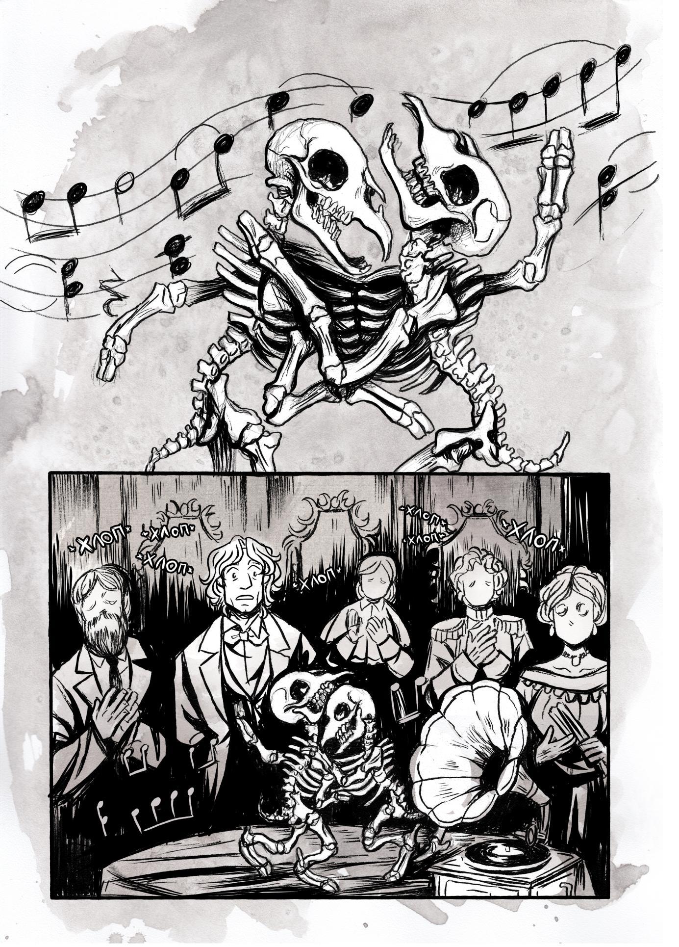 Комикс художницы Карнессы «Speak of the Dead» (трехцветный, к чёрно-белому стандартному дуэту активно примешивается кроваво-бардовый, сами понимаете, для чего) балансирует на границе гуро, расчленёнки и прочей околосмертной мистико-физиологической жести, которую как-то привычнее ожидать от японских мастеров телесного и потустороннего ужаса вроде Дзюндзи Ито, и русского народного фольклора, но не в его жизнерадостном воплощении «разлюли-люли!», а в традиции страшных сказок, которые дожили до нашего времени телевизионными репортажами про маньяков. В первом томе конкретно сюжет эволюционирует от лубочных сказаний про Колдуна и Смерть, через деревенский хоррор к купеческой готике в стиле «Семьи вурдалака» Толстого, добираясь в итоге до историй, пересказ которых обычно заканчивается фразой «Даааа, жалко… Ну, ладно, помянем!». От азиатской традиции, кстати, тут не только живая мертвечина и ковыряние в бурой массе кишок, а ещё и связывающая каким-то образом всё вышесказанное разумная сороконожка, ловко заползающая в рот персонажам. Яков тоже является важным связующим звеном сюжета. Однажды на прозекторском столе оказывается тело, внутри которого Яков находит кассетный плеер… его собственный, который он много лет назад подарил мёртвому мальчишке, встреченному на кладбище. Из тот встречи получилась грустная история о прощении и незапиваемом ничем чувстве вины. Нынешняя встреча оборачивается для Якова неожиданной просьбой: он должен создать новое тело из того, что у него есть под рукой (то есть, в морге), для одной сущности.