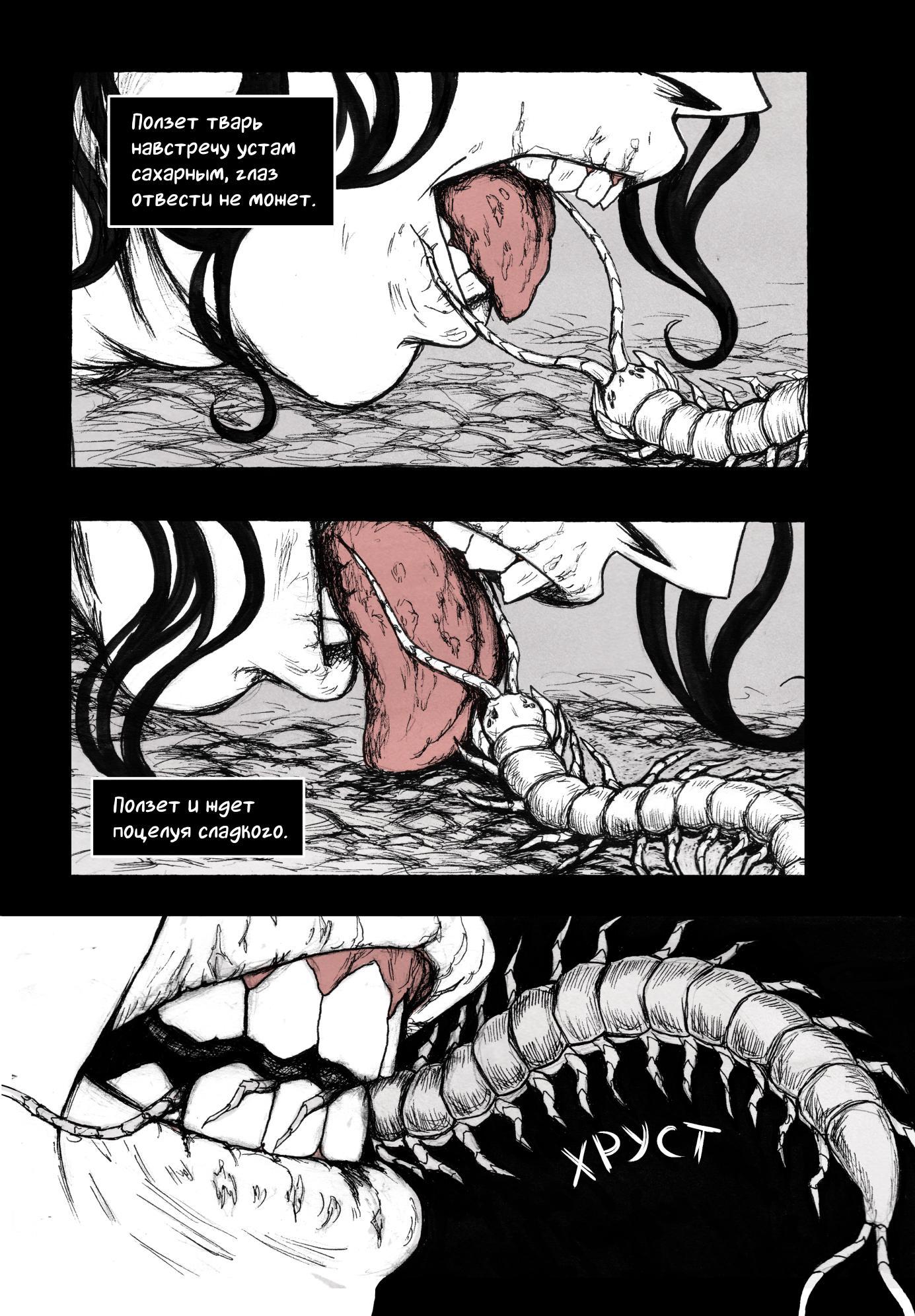 Честно говоря, сюжетная линия Якова и примкнувшая к ней линия Даниила, попадающего на классический для хоррор-литературы бал-маскарад Смерти, при всей своей важности всё же задвигается на второй план рассказами из разных временных периодов. Реальность Якова представлена больше горячечными некровидениями, когда не очень понятно, взаправду тут всё происходит, или это морок. Сороконожка же, оказавшись Владыкой подземного царства, немало страха и ужаса раскидала по земле. Однажды заключила договор с голодной и брошенной девушкой, и пусть та её обманула (внезапно, обычно наоборот бывает), желание было выполнено. История о невесте с того света, куда скоро отправляется и её жених, и о том, что в наши дни принято называть «токсичными отношениями», по самые верха завалена гнилой пищей, костями, червями, но особенно доставляет выпотрошенный и освежёванный кролик в роли вестника Смерти. После мощного визуала ваше воображение на каждый треск и писк за стеной будет услужливо доказывать, что там копошатся полчища огромных насекомых.