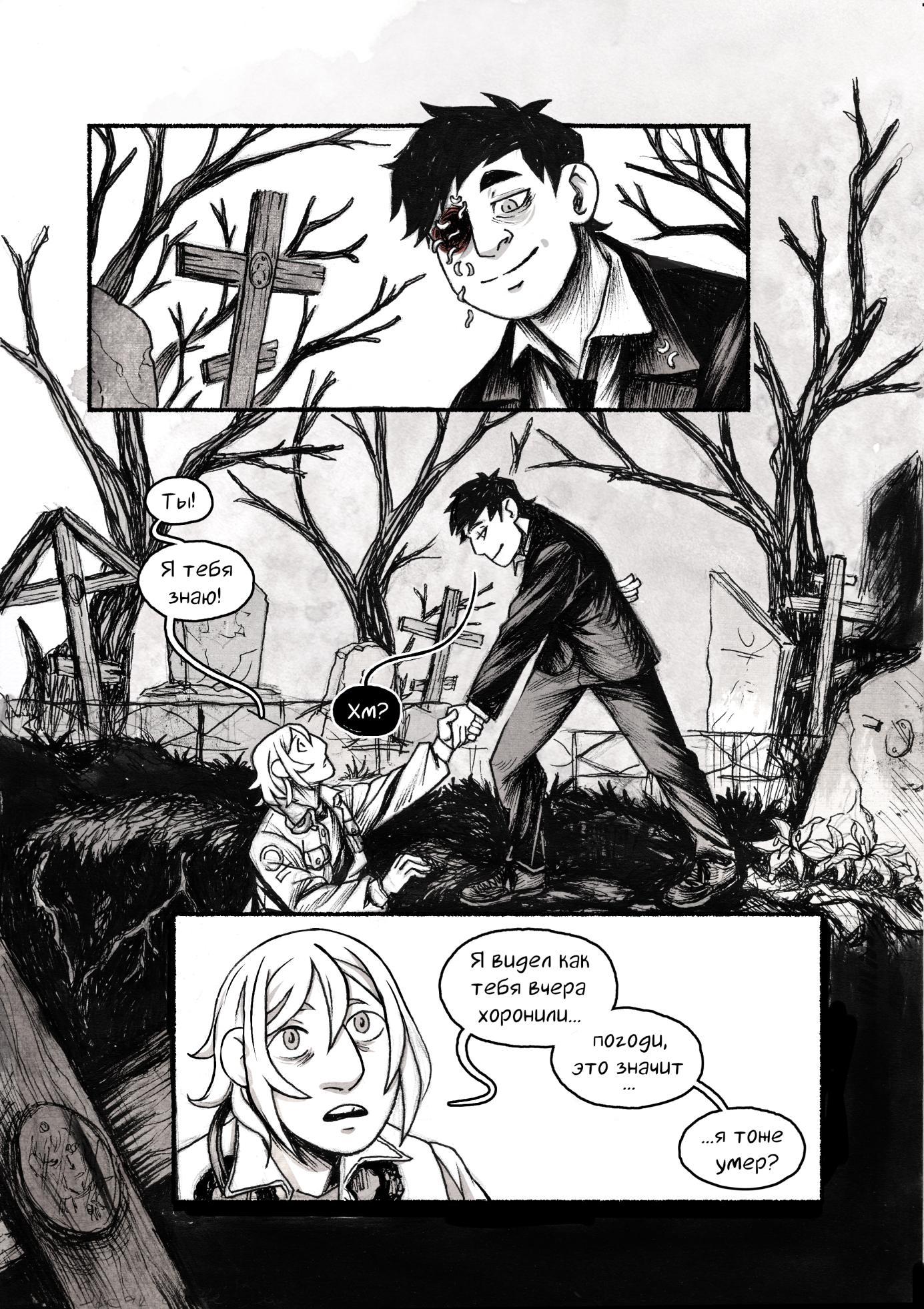 Далее следует глава «Вдова графа Сорокина», где главный герой Аркадий мечтает сделать предложение молодой, недавно овдовевшей красавице, но та отказывается отвечать многочисленным ухажерам без благословения покойного мужа. Аркадий находит способ благодаря Агафье Петровне, чьё присутствие связывает разные сюжетные линии, но столь вожделенное «Да, согласна!» тянет за собой ситуацию, мягко говоря, абсурдную, фантасмагорическую и жуткую. Кто-то здесь явно окажется третьим лишним. Тут хочется выразить моё почтение Карнессе за умение выдумывать не банальные «страшилки». В полной мере это относится к истории уже из наших дней, где один персонаж, такой же неприкаянный и странный как Яков, умеет призывать Ангела, воскрешающего мёртвых, а другой мечтает овладеть этим даром, чтобы соединиться со своей идеальной жертвой. В итоге творится жесть, особенно страшно за девушку, запертую в подвале маньяка, ведь смерть для неё окажется далеко не концом. Если бы это кто-то экранизировал, люди бы крутили пальцем у виска, в формате комикса всё показанное тоже вызывает острую эмпатию и внутреннее сопротивление, но всё равно, воспринимается как-то полегче. Страшная изобретательность автора шокирует, ничего другого сказать не могу. Ну, кроме того, что вот два последние рассказа запросто могут войти в список лучших отечественных хоррор-историй.
