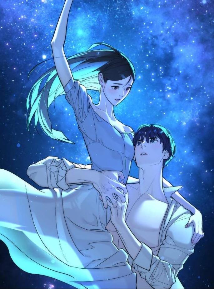 Я по-прежнему ничего не смыслю в балете и непонимание того, что значат все эти «па-де-де» «батман тандю», явно мешает мне насладиться гармонией танца, но в процессе чтения данной манхвы я постоянно ловил себя на мысли, что это выглядит очень красиво. Создательница, хоть и рисовала изначально вебтун, не пошла по пути «тут можно сделать и попроще», она максимально вложилась в рисунок, наполнив его эстетикой, движением и волнующей чувственностью. Если она ставила перед собой задачу, чтобы тот самый трепет первой любви испытали на себе не только персонажи, но и читатели, ей это удалось. Центральная сцена всей истории - собственно, танец Кан и Син, во время которого персонажи максимально сближаются. И Соын переживает целую бурю чувств, вслушиваясь в ритм своего учащенного сердцебиения и пытаясь разобраться в сигналах своего тела, очень энергично реагирующего на прикосновения молодого человека пунцовыми щеками как минимум. Тут всё пристойно, но видно, что эмоции постоянно требуют «перейти за грань». Также к главным плюсам манхвы стоит отнести работу с цветом. Голубое платье Соын и распахнутая белая рубаха Джэхви формируют какое-то неземное сочетание ночных оттенков, переносящих юношу и девушку то ли на океанское дно, в окружение стаек флуоресцентных микросуществ, то ли прямиком в звёздное небо, где пара кружится и сближается на фоне звёзд. Это, повторюсь ещё раз, красиво. И чувственно. Финал истории старательно изображает сказочный твист, но всё равно кажется, что танцы и связанные с ними переживания были во сто крат важнее попыток сделать «Вот это поворот!».