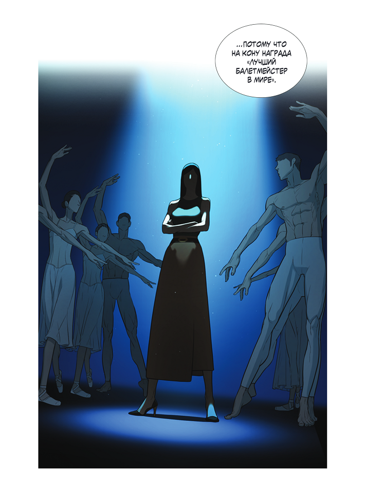 В качестве объяснения, почему так получилось, Лин Лина использует стандартное для Южной Кореи объяснение: детство у Соын было тяжелым, юность тоже, приходилось много-много впахивать, учиться, работать, в общем, выживать, на влюблённости и отношения времени не было. Корейский менталитет как он есть. Поэтому новая постановка для Кан не только серьезнейший профессиональный вызов, но и блуждание по неизведанным территориям, по terra incognita чувств. Усугубляет наличие подле Кан её бывшей однокурсницы, которая кружит вокруг завистливой змеей и брызжет ядом между словами «Тебе-то откуда об этом знать!». Но однажды на репетиции Кан встречается с молодым человеком, который представляется Син Джэхвином и утверждает, что он танцор из труппы Соын… просто она не всех ещё танцоров запомнила, можно понять. А чуть позже обстоятельства сводят уже вместе уже в ночном зале, на сцене. Отмечу, что перед нами довольно редкий пример короткой манхвы, выросшей из популярного вебтуна, тут не бесконечный сериал, а компактная история, крутящаяся вокруг танцев и страстных, внезапных чувств. При этом сюжетные твисты неплохо вписывают эту историю в вайб рождественских праздников, когда всегда немного веришь в чудо. Так что даже логично, что на русском языке манхва вышла в зимние месяцы, у нас с Рождеством и балет отлично сочетается. Хотя на самом деле сюжет «ТЕВНПУ» больше всего напоминает о тонких любовных романах в мягкой обложке. Лин Лина виртуозно, с точки зрения художественного стиля, обыгрывает ещё один, помимо амбиций и тяжелой работы в ущерб личной жизни, стереотип о корейцах - они тут почти все максимально, до невероятного красивы. Особенно пара главных героев. Когда в кадре впервые появляется Джэхвин (выглядящий как раз в стиле обложек к упомянутым любовным романам), даже 300% натурал-гетеросексуал непроизвольно начнёт считать количество кубиков пресса на теле танцора. А уж когда они с Кан начнут танцевать…