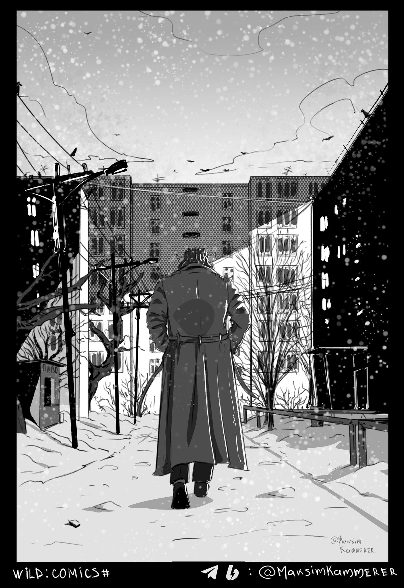 Плюс тут еще много эскизов, зарисовок и реплик на тему «Хотелось бы добавить вот это, рассказать про вот это». Есть подробности «Октябрьской бойни», которая так и не была нарисована. По этим отрезкам и фрагментам заметно, что у авторов много задумок, отлично вписавшихся бы в эпоху умирающего Союза, об атмосфере которой у людей, взявшихся за «Wild», есть уверенное представление. Посмотрим, во что это выльется в дальнейшем. Первый том комикса будем рассматривать как знакомство, презентацию. Сама идея мне показалась интересной ещё на стадии анонса, и сейчас я в этом мнении еще больше утвердился. Рисунок и выбранные цвета хорошо работают на атмосферу, Волков – вполне живой персонаж, хоть и каноничный, но со своими проблемами и переживаниями. Не зря же он так стильно курит на ветру, увеличивая сизым дымом горечь этого мира. Чёрно-белый, с небольшими цветными вставками комикс издан своими силами, средства собирались на краудфандинге, поэтому на первых страницах тут благодарности спонсорам и портреты суперспонсоров. Кстати, суммы сборов на бумстартере – заявленные изначально 250000 вылились в итоге в 1213000 – говорят о том, что «Wild» любителей комиксов заинтересовал, это убедительный пример того, как оригинальная и стильно реализованная идея всегда найдёт своего читателя. Как обычно в этих случаях, можно было выбирать разные обложки и заполучить полиграфические ништяки. Автограф Максима Каммерера прилагается ко всем изданиям. Мягкий переплёт, тпб, плотная бумага, 120 страниц, общий тираж не указан.