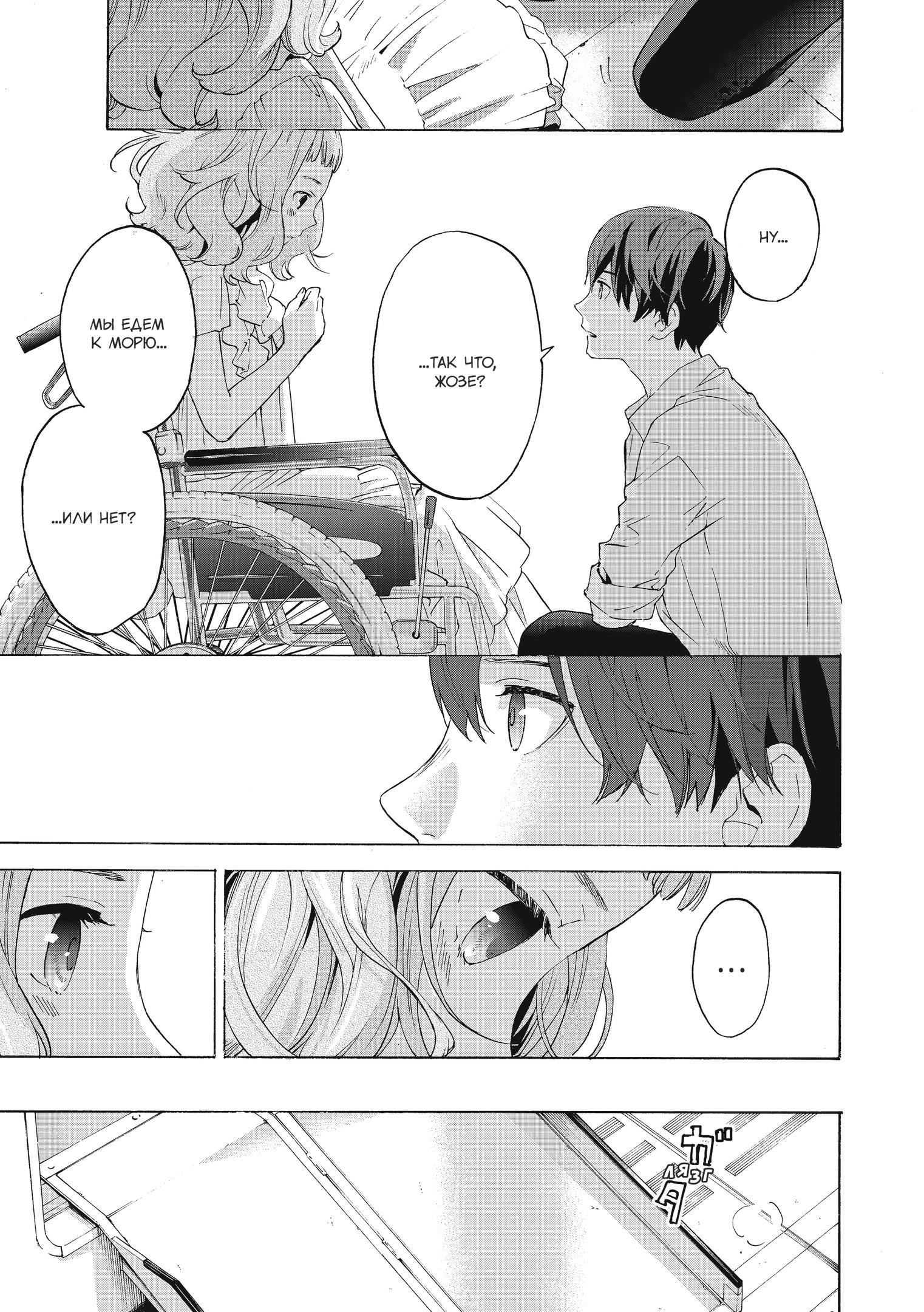 Сложно даже посчитать, сколько раз Цунэо проклял свою отзывчивость, потому что Кумико оказалась настоящим взбалмошным тираном. Называет своего «пажа» «халявщиком-извращенцем» и устаивает ему выбешивающие квесты типа «посчитай, сколько соломинок в одной циновке» или «хочу знать, сколько часов человек может простоять на коленях». А ещё она утверждает, что может разговаривать с уличным котом и требует звать её не Кумико, а Жозе. Да, как героиню одного из романов Франсуазы Саган. И эта увлечённость хорошей литературой помогает Цунэо потихоньку подобраться к истинной сути Жозе. Ведь она – не просто избалованная девушка (с «пажом» они, кстати, почти ровесники, но так этого и не скажешь), а пленница. Не только своего недуга и не только инвалидной коляски, а родного дома, пространство которого кажется ей привычным и понятным, а мир вокруг отделён границей строжайшего табу и паническим страхом перед опасностями, таящимся там. Ведь за стенами дома – зверье, тигры, страх, угрозы. Но в книжках-то, которые так любит читать Жозе, написано совсем другое. Там море, романтика, любовь… то, до чего Жозе, как ей кажется, просто физически не сможет добраться. Помочь в этом ей должен Цунэо. Сначала он поможет своей раздражающей (именно так воспринимается Кумико в начале манги, с этим ничего не поделаешь) подопечной узнать, какая на вкус морская вода. Потом помогает записаться в библиотеку, где есть не только другие книги Саган, но и группа маленьких детей, которые совсем не прочь, чтобы им почитали интересную книжку. Кумико/Жозе попадает в руки очень символичная книга – «Русалочка», жаль только, что чтец из девушки так себе, сказываются годы заточения и отсутствие социализации. Зато можно попробовать наладить контакт и общение другим способом. Например… с помощью бумаги, красок и цветных карандашей.